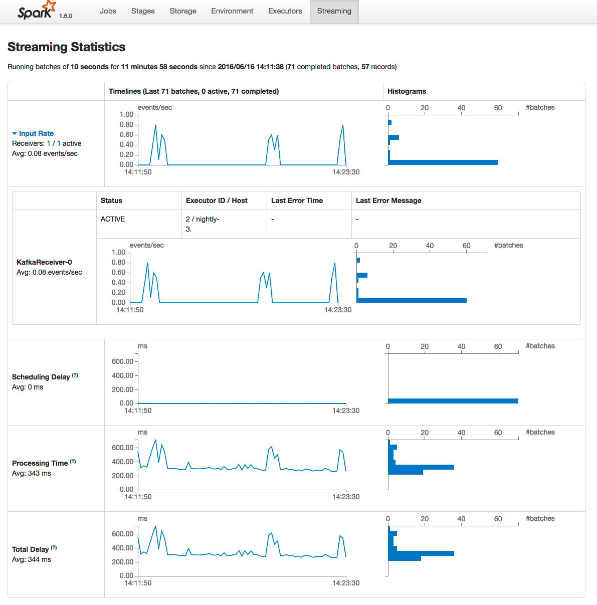 To view the details of a specific batch, click a link in the Batch Time column. Clicking the 2016/06/16 14:23:20 link with 8 events in the batch, provides the following details: