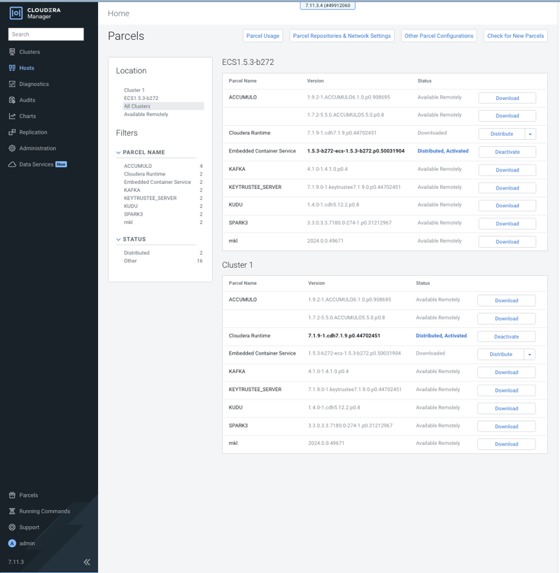 Parcels page in Cloudera Manager, you can manage parcel installation and activation and