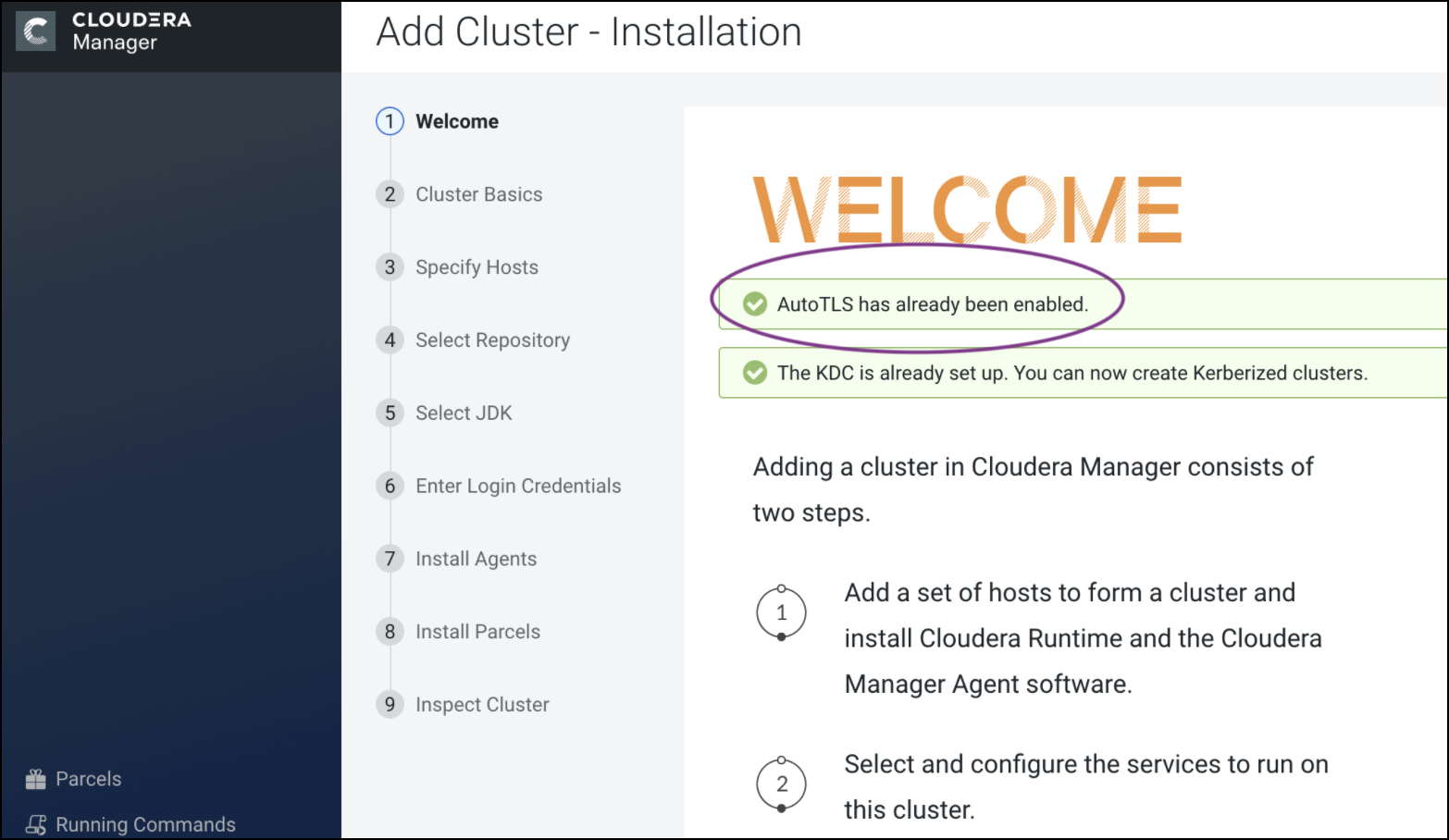 With either of these options, you can reuse the existing TLS settings when creating a new cluster on a Cloudera Manager with Auto-TLS enabled. When you launch the wizard to create a new cluster you should see the following message. Now, when you deploy the cluster, all services will be automatically configured with wire encryption.