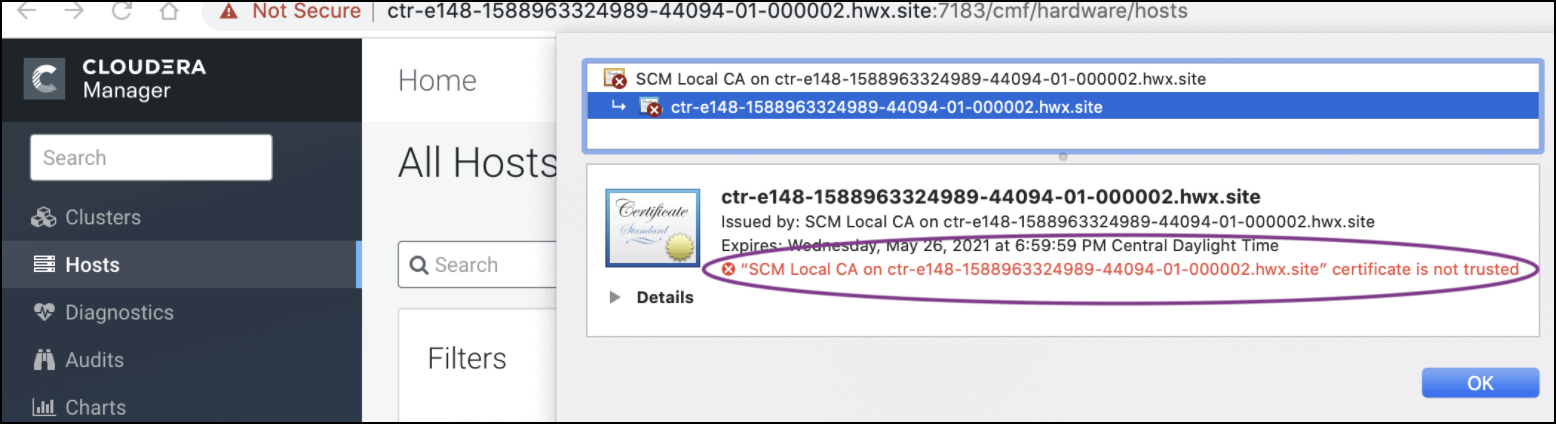 You are prompted to start Cloudera Manager, followed by Cloudera management services and any impacted clusters. When you start the Cloudera Manager server, you should see the UI at the TLS port 7183 by default. The browser displays a self-signed certificate from the SCM Local CA authority, as shown below. The browser displays a warning because it is not aware of the Root CA generated by Cloudera Manager. When the Root CA is imported into the client browser’s truststore, this warning is not displayed by the browser.