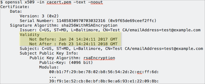 Certificates installed throughout TLS/SSL-configured clusters have a defined lifetime. That lifetime begins on a certain date and ends on another date, typically a year or two later as specified in the certificate's validity attribute. For example, the following certificate is valid between January 24, 2017 and February 23, 2018 only: