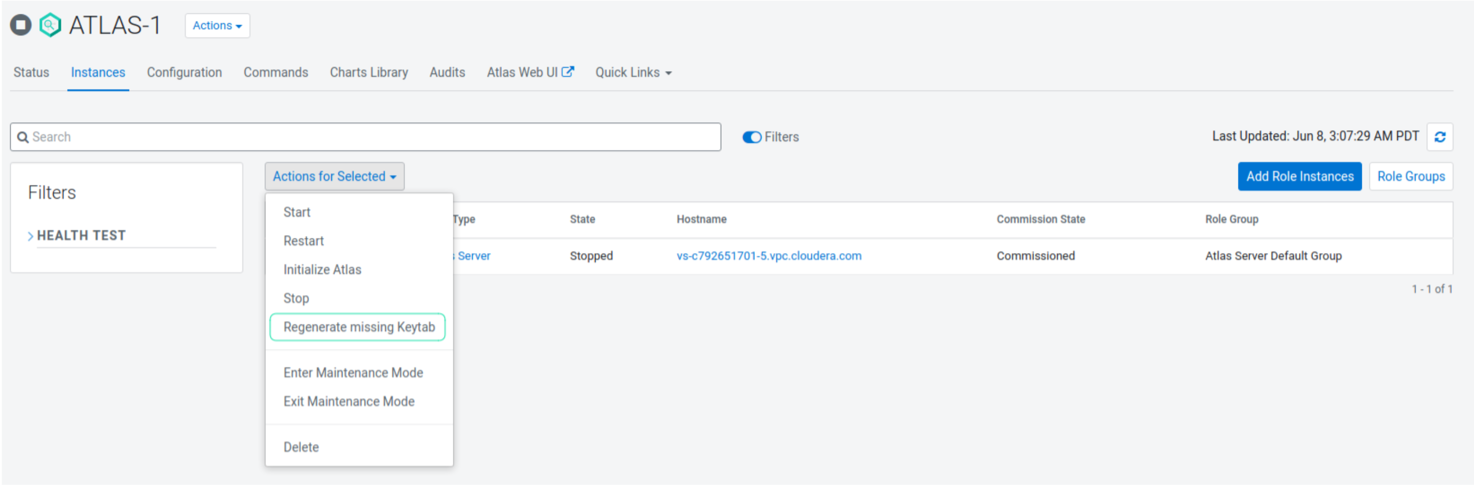 In the Instances tab, click Actions to Selected and select Regenerate missing keytab. Click Save.