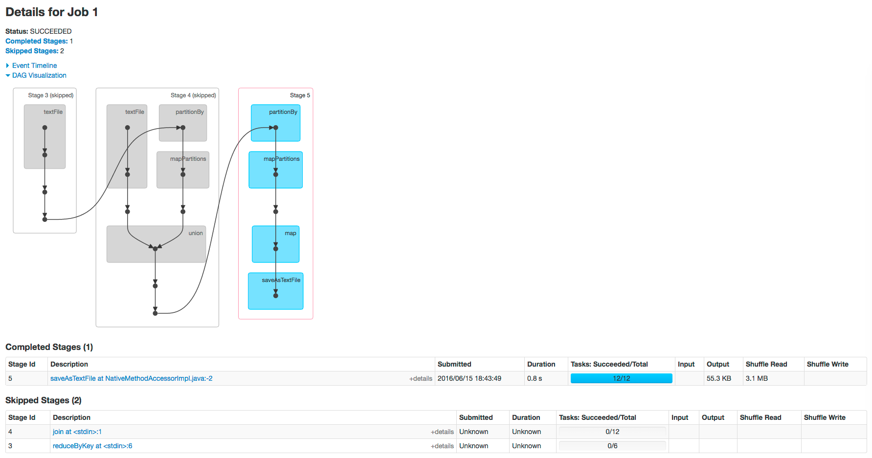 Consider a job consisting of a set of transformation to join data from an accounts dataset with a weblogs dataset in order to determine the total number of web results for every account and then an action write the result to HDFS. In this example, the write is performed twice, resulting in two jobs. To view the application UI, in the History Server click the link in the App ID column: