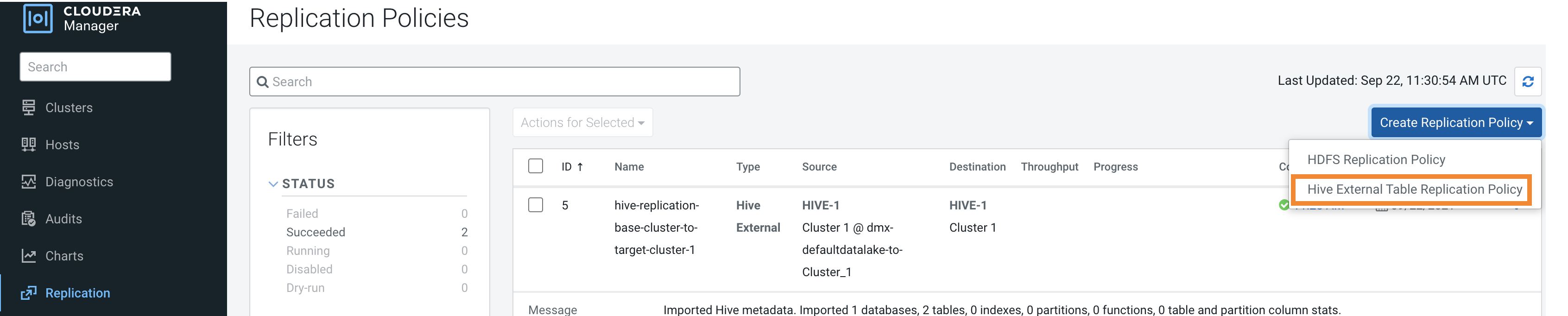 Creating a Hive external table replication policy