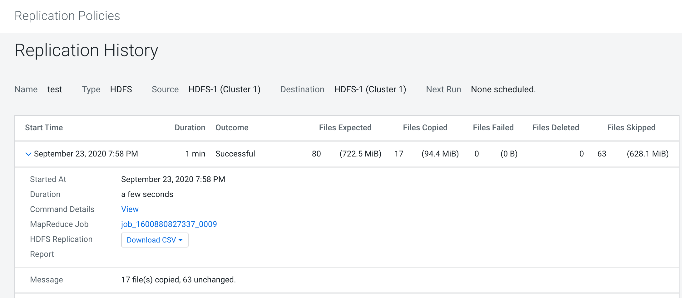 History page when you click Actions > Show History to view the previously run replication jobs:
