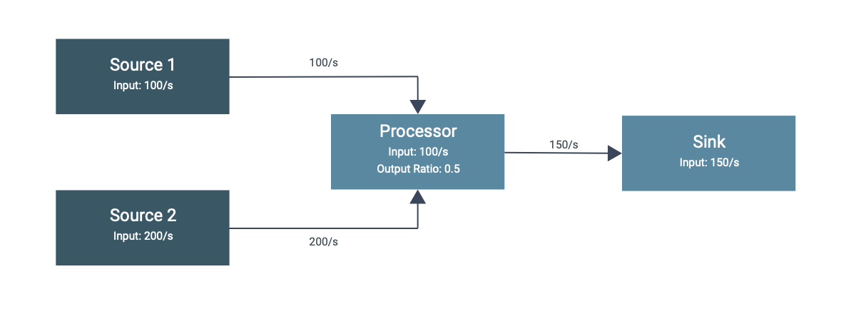 The autoscaler algorithm calculates the required processing capacity and target data rate for each operator starting from the source. The target data rate for the source vertices is equal to the incoming data rate. For downstream operators, the target data rate is calculated as the sum of the input (upstream) operators output data rate along the given edge in the processing graph.