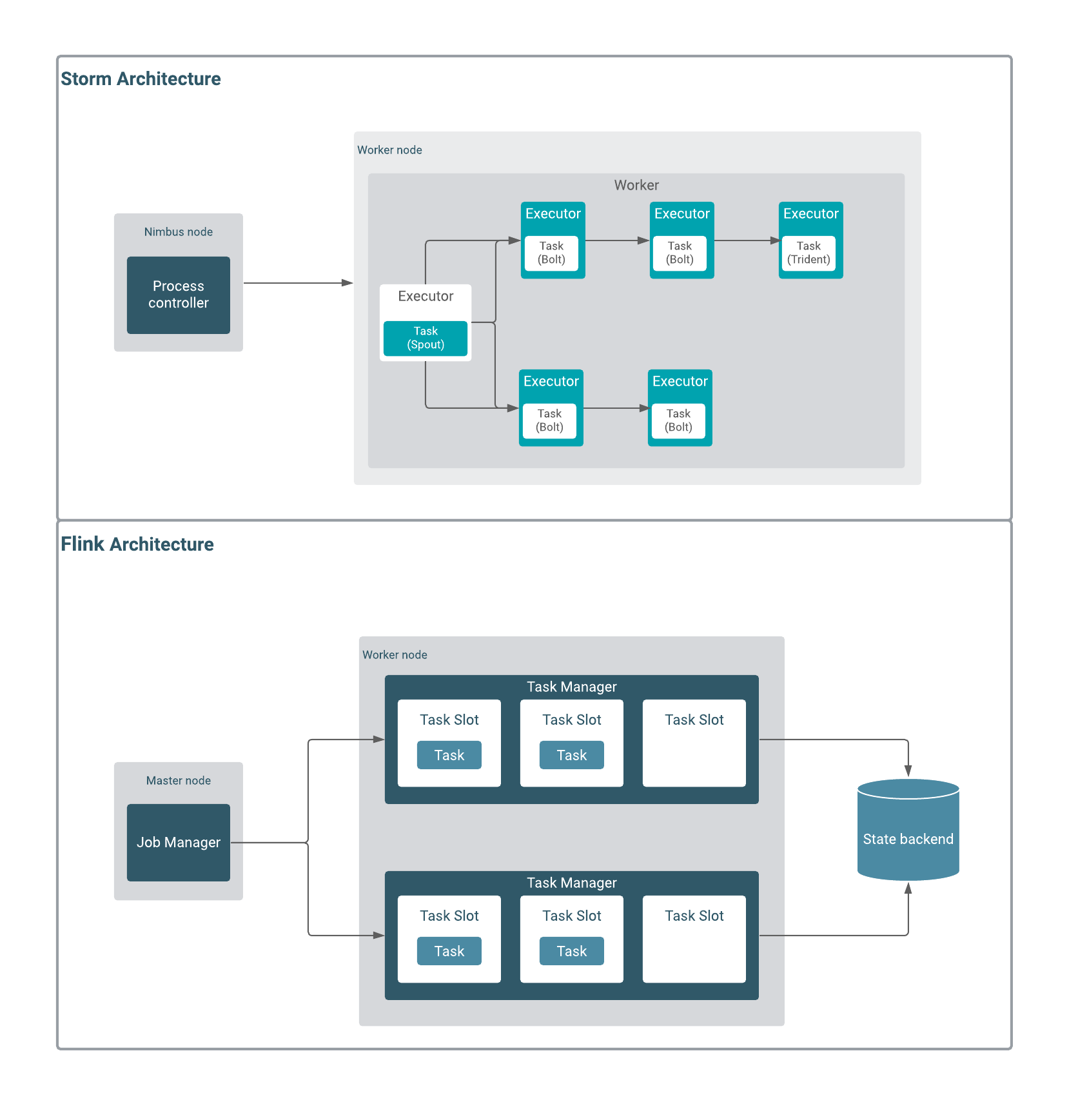 The basic architecture of task execution is similar in Storm and Flink. The main difference between the two systems is that Workers and Executors are responsible for executing the tasks in Storm, while in Flink the execution is done by only the Task Managers. The Task Managers also manage the state backend, which is a durable storage for storing states.
