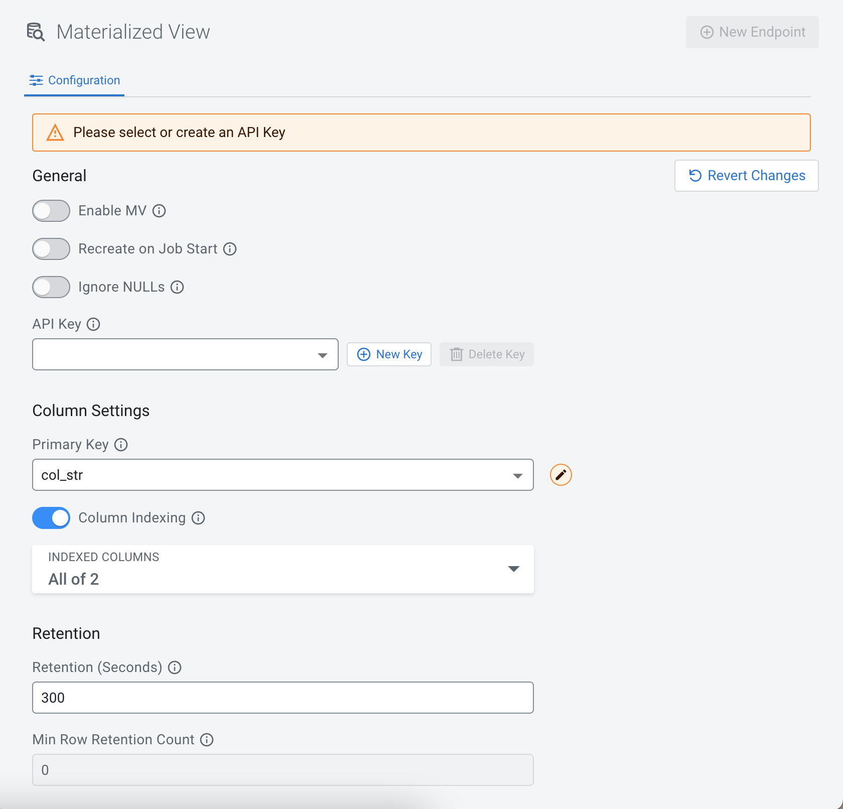 In case there are no API Keys, click Add API key, or click Materialized Views from the main menu. The add API key window appears. Provide a name for the API key, and click Save Changes.
