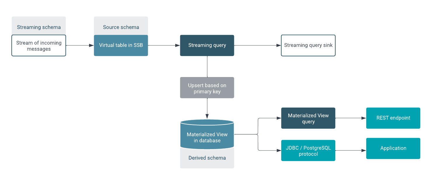 Materialized Views are in synchronization with the mutating stream - they are updated by a primary key as data flows through the system. The data is updated by a given key, and it represents the latest view of the data by key. The following illustration shows the process of a Materialized View query in streaming SQL.