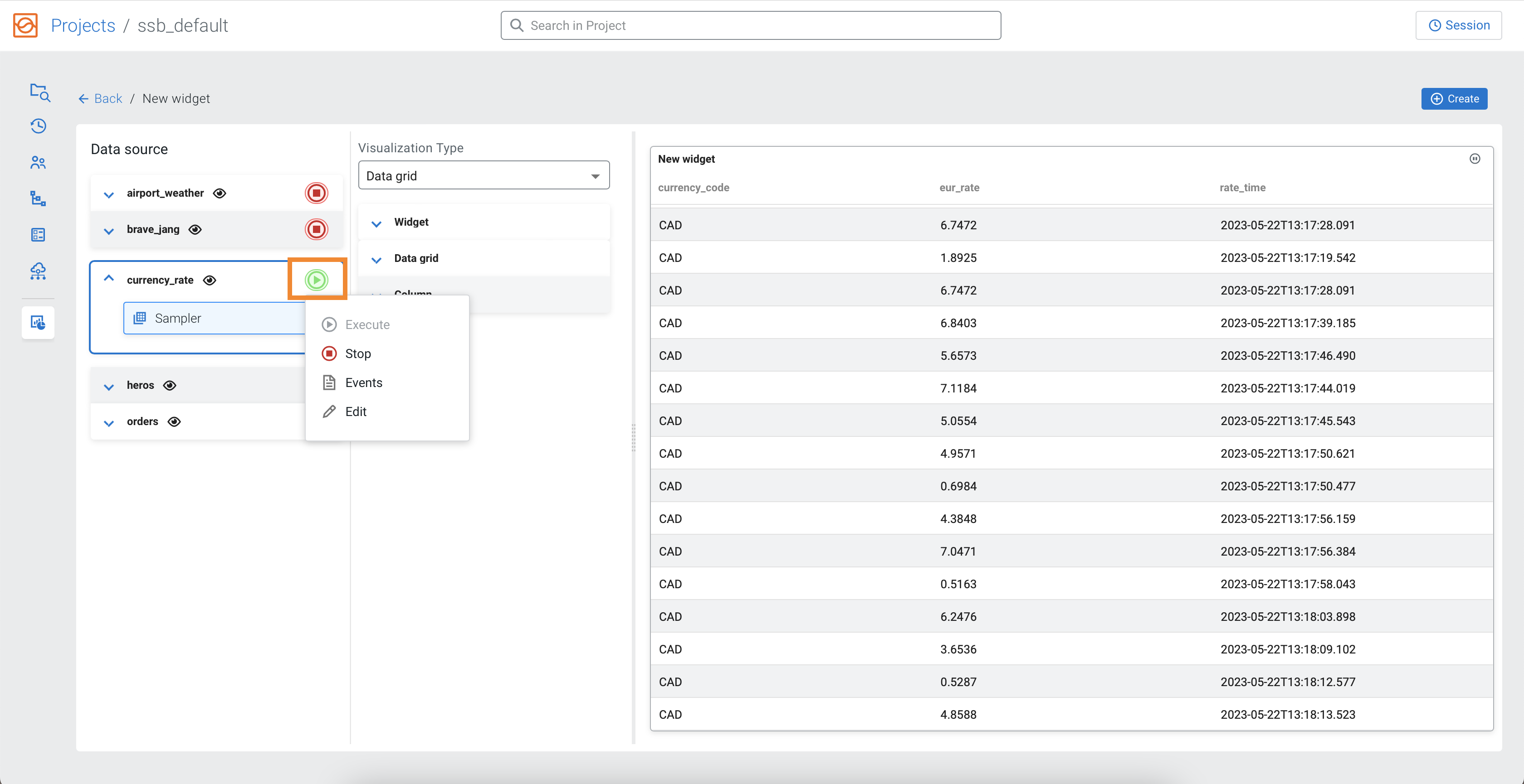 You can Execute a stopped job when you want to use it for previewing the data on a visualization, and you can also Stop the running job if you no longer need it. When using sampling as a data source, you cannot select the sampler if the job is stopped. If a Materialized View endpoint is used as a data source, you can view the data on the visualization as long as the data retention time is configured in the Materialized View settings.
