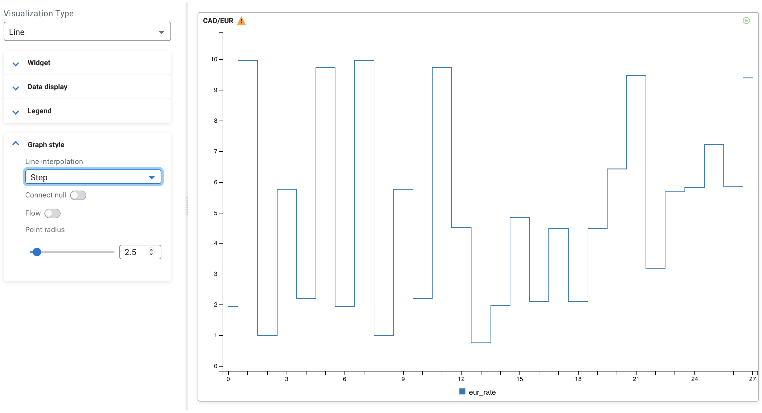 Determines the line interpolation of the visualization. You have the option to select Step as well as the interpolation as shown in the following example: