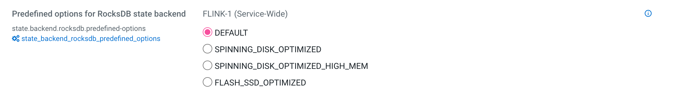 EmbeddedRocksDBStateBackendfor theStreamExecutionEnvironmentof the Flink job as shown in the following example:EmbeddedRocksDBStateBackend.setPredefinedOptions(PredefinedOptions.SPINNING_DISK_OPTIMIZED_HIGH_MEM)