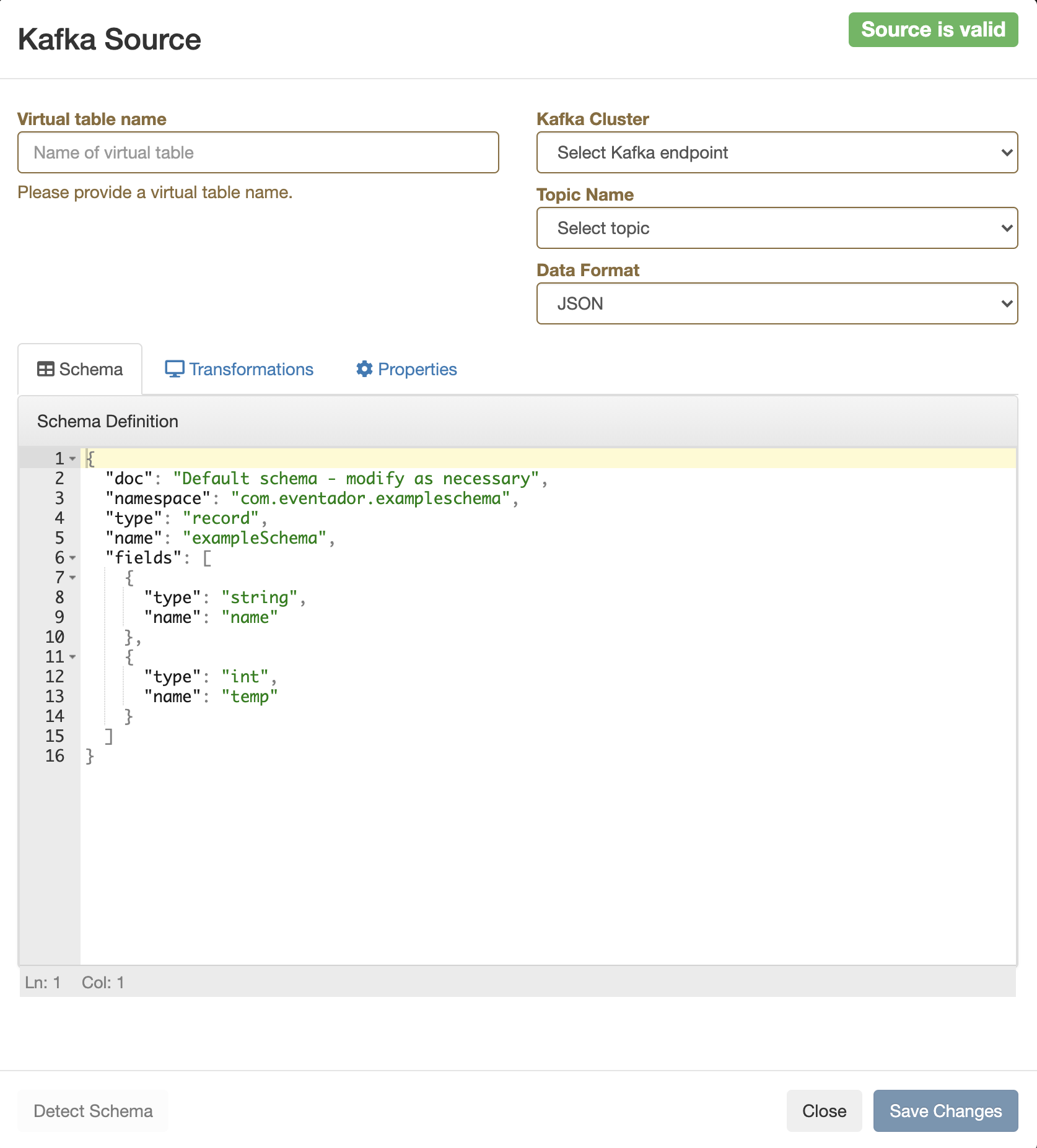 You can use the registered Kafka source to create a Kafka Virtual Table Source. You