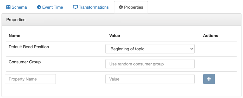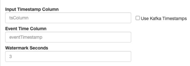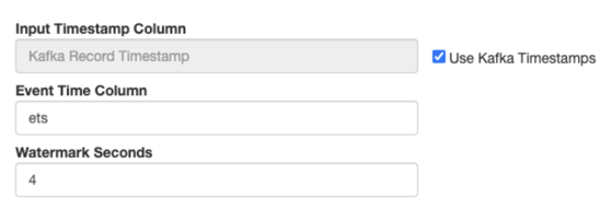 - Input Timestamp Column: name of the timestamp column in the Kafka table from where the event time column is mapped