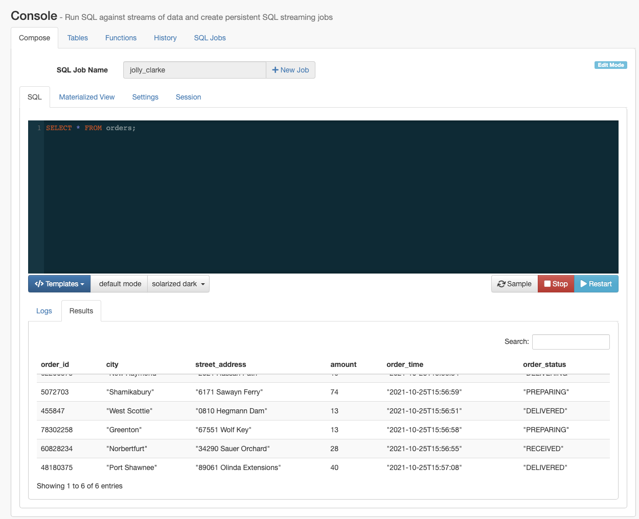 When you execute a query, a Flink job is created in the background. You can see more detailes about the created Flink job by navigating to the SQL Jobs tab and accessing the Flink Dashboard for the running job. You can also reload the SQL job into the SQL window to edit the job, or stop the job from the SQL Jobs tab.