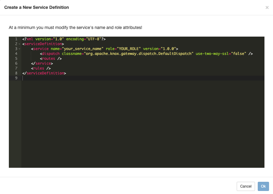 <?xml version="1.0" encoding="UTF-8"?> <serviceDefinitions> <serviceDefinition> <service name="ssb-ssc-ui" role="SSB-SSC-UI" version="1.6.0.0"> <dispatch classname="org.apache.knox.gateway.dispatch.ConfigurableDispatch" use-two-way-ssl="false"> <param> <name>responseExcludeHeaders</name> <value>Www-Authenticate</value> </param> </dispatch> <metadata> <context>/ssb-ssc-ui</context> <description>SQL Streaming Builder - Streaming SQL Console - UI</description> <shortDesc>SSB Console</shortDesc> <type>UI</type> </metadata> <routes> <route path="/ssb-ssc-ui/"> <rewrite apply="SSB-SSC-UI/filter/outbound/headers" to="response.headers"/> <rewrite apply="SSB-SSC-UI/filter/outbound/body" to="response.body"/> </route> <route path="/ssb-ssc-ui/**"> <rewrite apply="SSB-SSC-UI/filter/outbound/headers" to="response.headers"/> <rewrite apply="SSB-SSC-UI/filter/outbound/body" to="response.body"/> </route> <route path="/ssb-ssc-ui/**?**"> <rewrite apply="SSB-SSC-UI/filter/outbound/headers" to="response.headers"/> <rewrite apply="SSB-SSC-UI/filter/outbound/body" to="response.body"/> </route> </routes> </service> <rules> <rule dir="IN" name="SSB-SSC-UI/rule/inbound/query" pattern="*://*:*/**/ssb-ssc-ui/{path=**}?{**}"> <rewrite template="{$serviceUrl[SSB-SSC-UI]}/{path=**}?{**}"/> </rule> <rule dir="IN" name="SSB-SSC-UI/rule/inbound/path" pattern="*://*:*/**/ssb-ssc-ui/{**}"> <rewrite template="{$serviceUrl[SSB-SSC-UI]}/{**}"/> </rule> <rule dir="IN" name="SSB-SSC-UI/rule/inbound/root" pattern="*://*:*/**/ssb-ssc-ui/"> <rewrite template="{$serviceUrl[SSB-SSC-UI]}/"/> </rule> <rule dir="OUT" flow="OR" name="SSB-SSC-UI/rule/outbound/header/links"> <match pattern="*://*:*/{path=**}?{**}"> <rewrite template="{$frontend[url]}/ssb-ssc-ui/{path=**}"/> </match> <match pattern="*://*:*/{path=**}"> <rewrite template="{$frontend[url]}/ssb-ssc-ui/{path=**}"/> </match> <match pattern="*://*:*/"> <rewrite template="{$frontend[url]}/ssb-ssc-ui/"/> </match> </rule> <rule dir="OUT" name="SSB-SSC-UI/rule/outbound/html/static" pattern="/static/{**}"> <rewrite template="{$frontend[url]}/ssb-ssc-ui/static/{**}"/> </rule> <rule dir="OUT" flow="OR" name="SSB-SSC-UI/rule/outbound/js/api"> <match pattern="/api/v1/query"/> <match pattern="/api/v1"> <rewrite template="{$frontend[path]}/ssb-ssc-ui/api/v1"/> </match> </rule> <rule dir="OUT" name="SSB-SSC-UI/rule/outbound/js/ws"> <match pattern="/socket.io"> <rewrite template="{$frontend[path]}/ssb-ssc-ws/socket.io"/> </match> </rule> <rule dir="OUT" flow="OR" name="SSB-SSC-UI/rule/outbound/html/link"> <match pattern="/{path=**}?{**}"> <rewrite template="{$frontend[url]}/ssb-ssc-ui/{path=**}?{**}"/> </match> <match pattern="/{**}"> <rewrite template="{$frontend[url]}/ssb-ssc-ui/{**}"/> </match> </rule> <filter name="SSB-SSC-UI/filter/outbound/headers"> <content type="application/x-http-headers"> <apply path="Location" rule="SSB-SSC-UI/rule/outbound/header/links"/> </content> </filter> <filter name="SSB-SSC-UI/filter/outbound/body"> <content type="*/javascript"> <apply path="/api/v1/query|/api/v1" rule="SSB-SSC-UI/rule/outbound/js/api"/> <apply path="/socket.io" rule="SSB-SSC-UI/rule/outbound/js/ws"/> </content> <content type="*/html"> <apply path="/static" rule="SSB-SSC-UI/rule/outbound/html/static"/> <apply path="/api/v1" rule="SSB-SSC-UI/rule/outbound/html/link"/> <apply path="/ui.*" rule="SSB-SSC-UI/rule/outbound/html/link"/> </content> </filter> </rules> </serviceDefinition> </serviceDefinitions> - Paste it to the New Service Definition window.