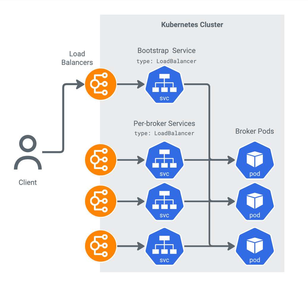 individual ClusterIP type Kubernetes services are set up for each broker. The