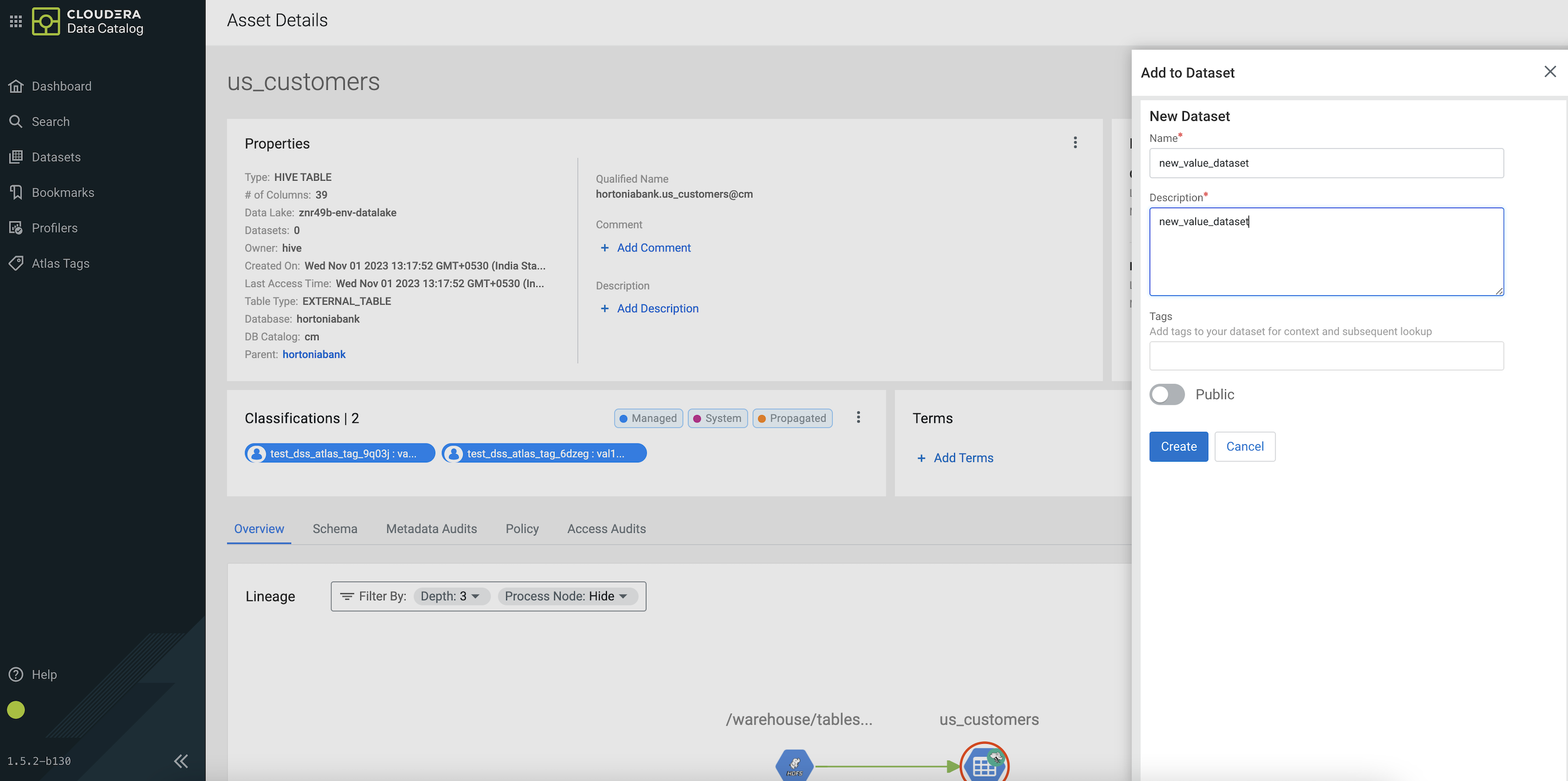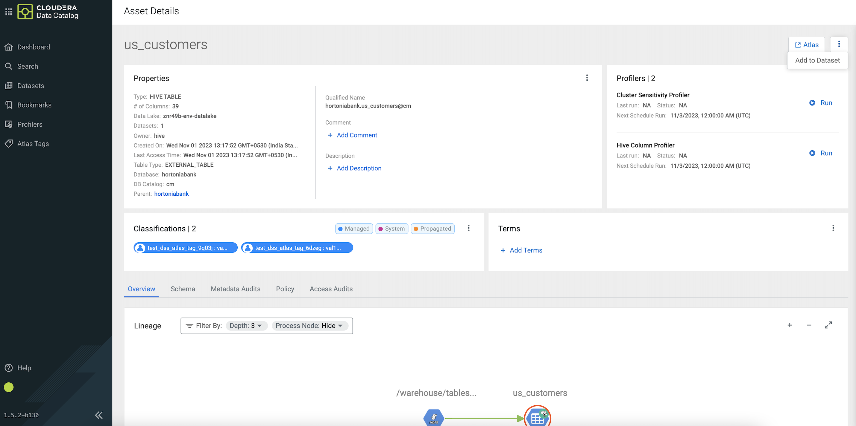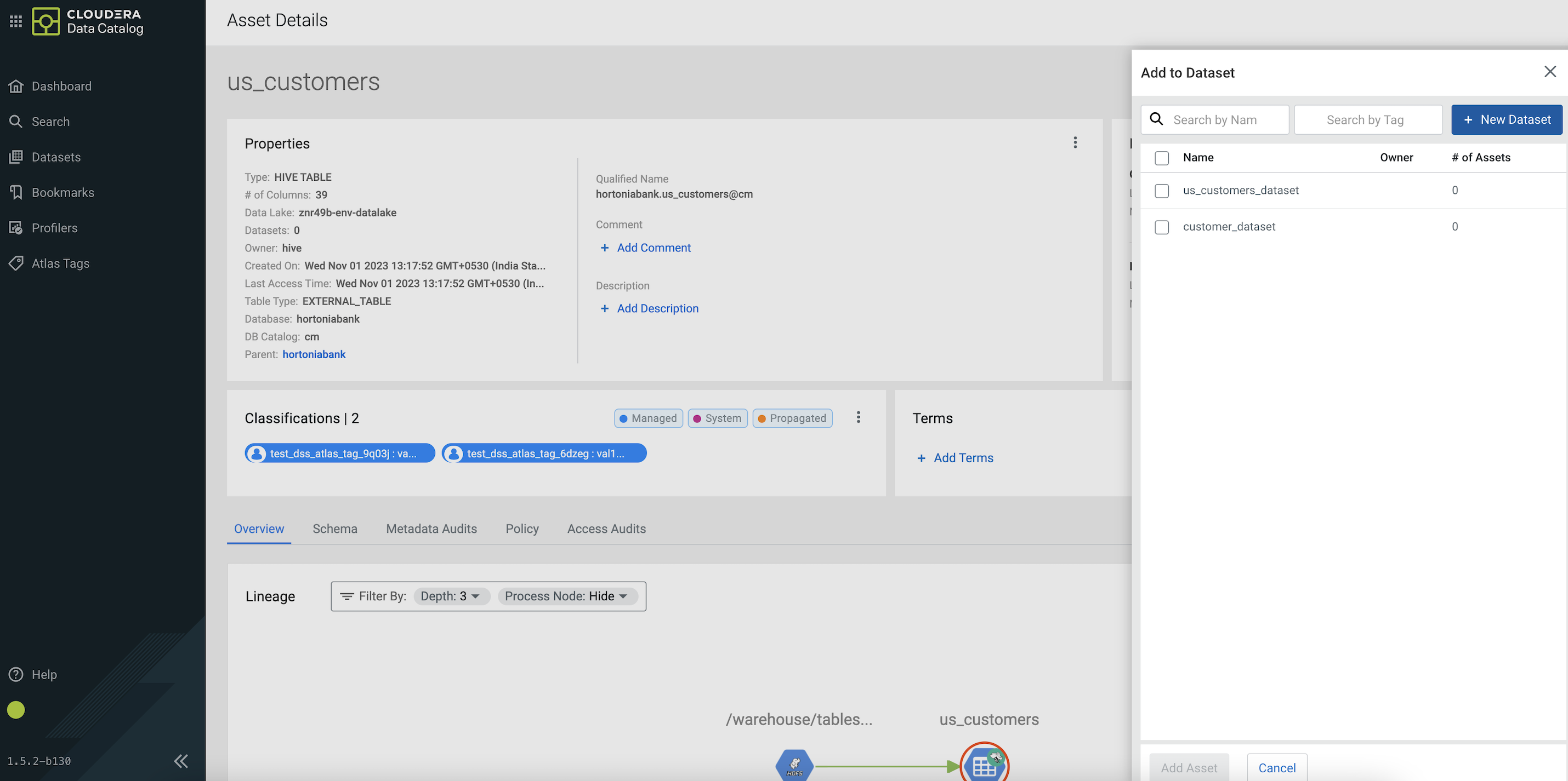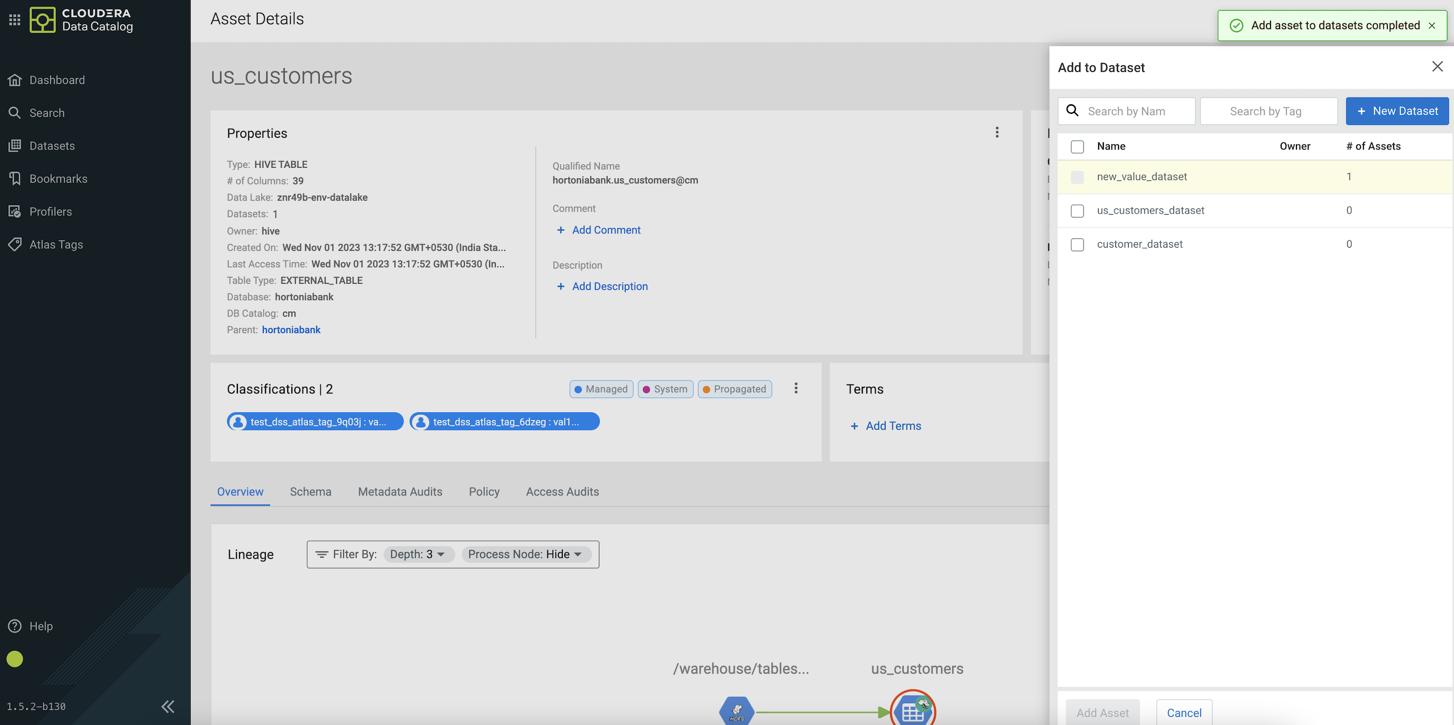 Adding Hive asset to one or more datasets on Asset Details screen