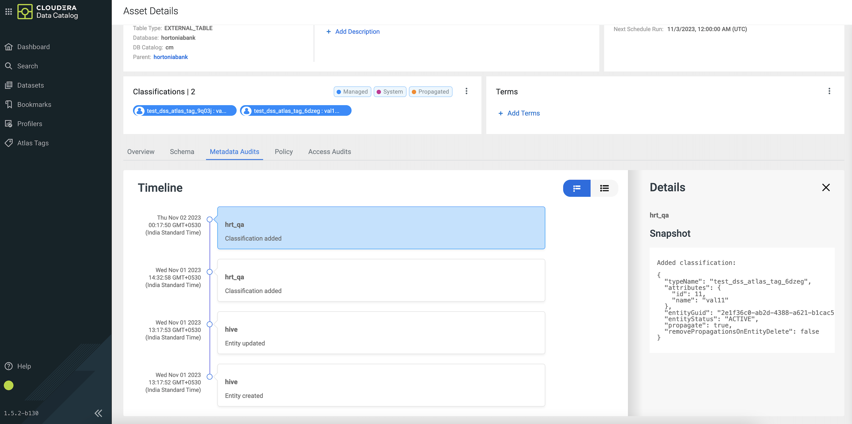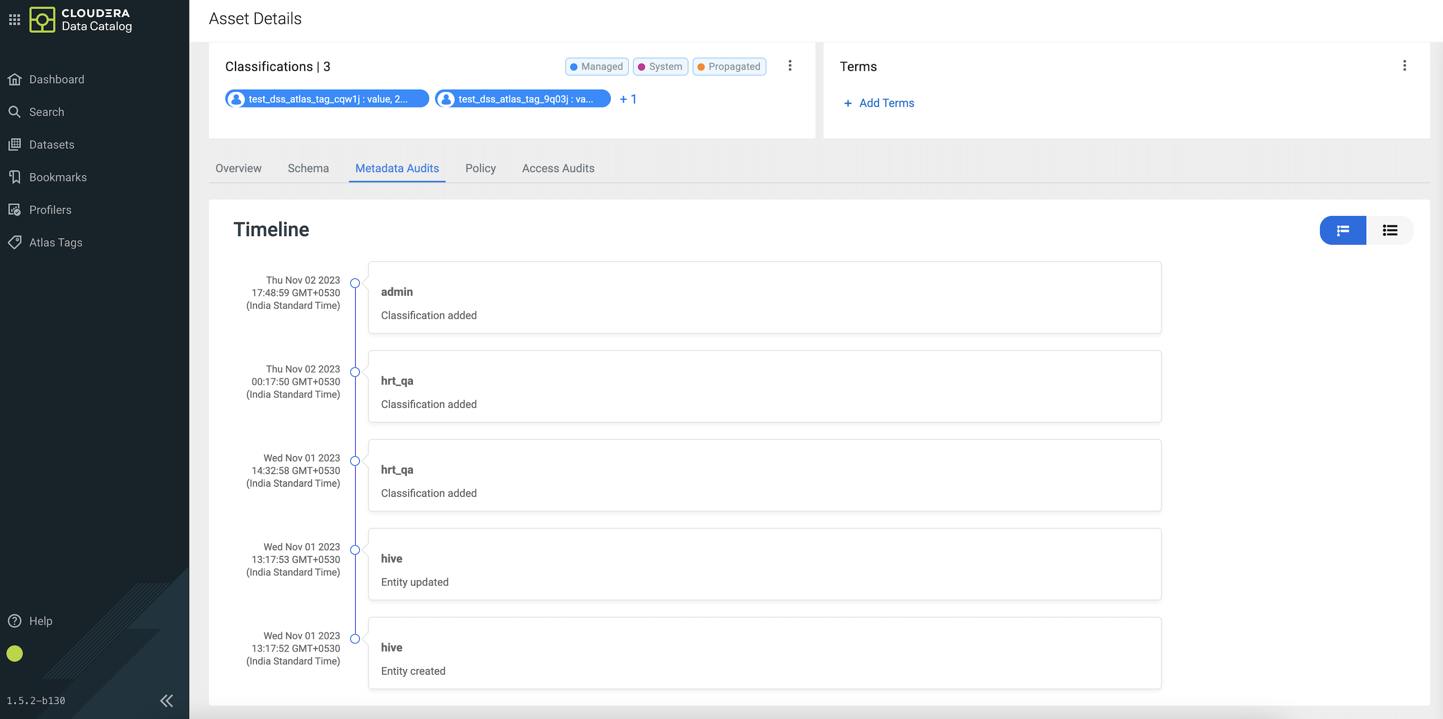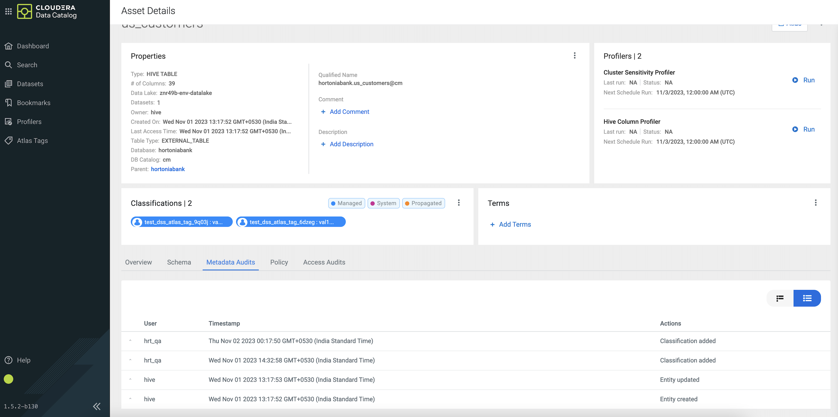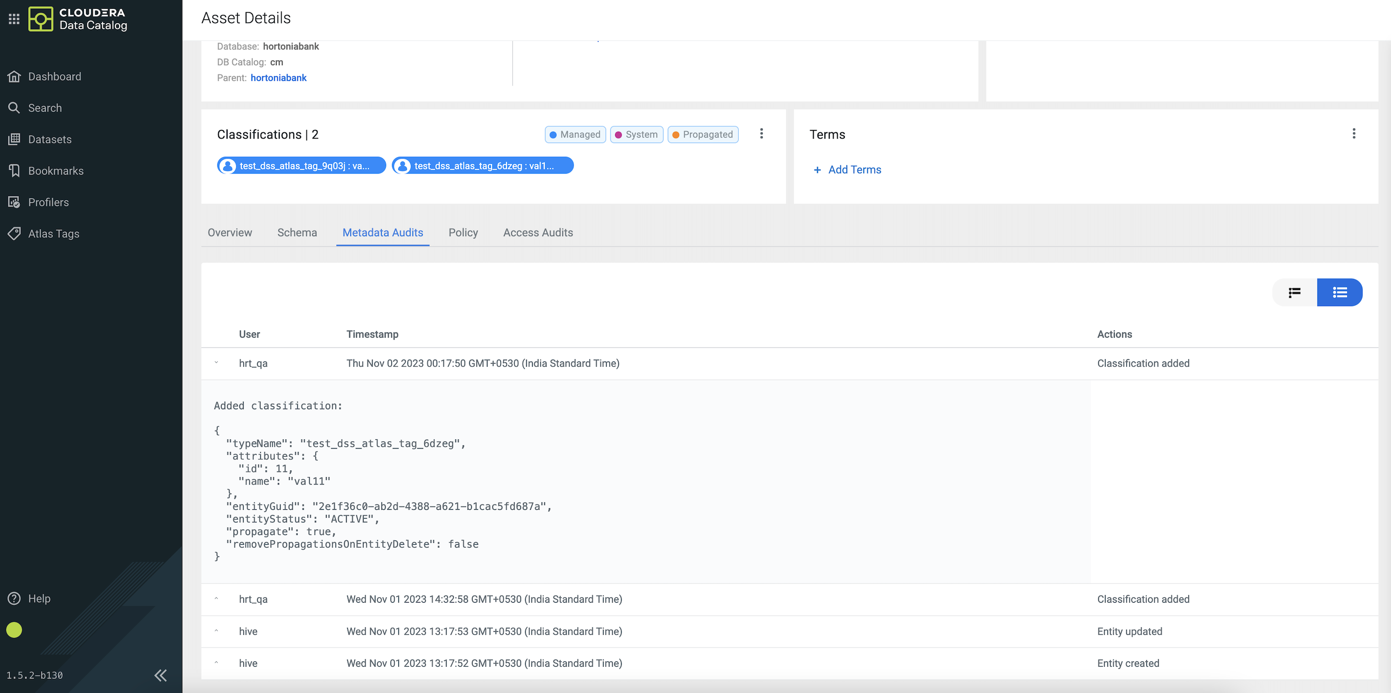 Information about the Atlas entity audit events are displayed for each entity in the Asset Details page in Data Catalog. Using this information, Data Stewards can distinguish between entity audits and data audits that emanate from Ranger.