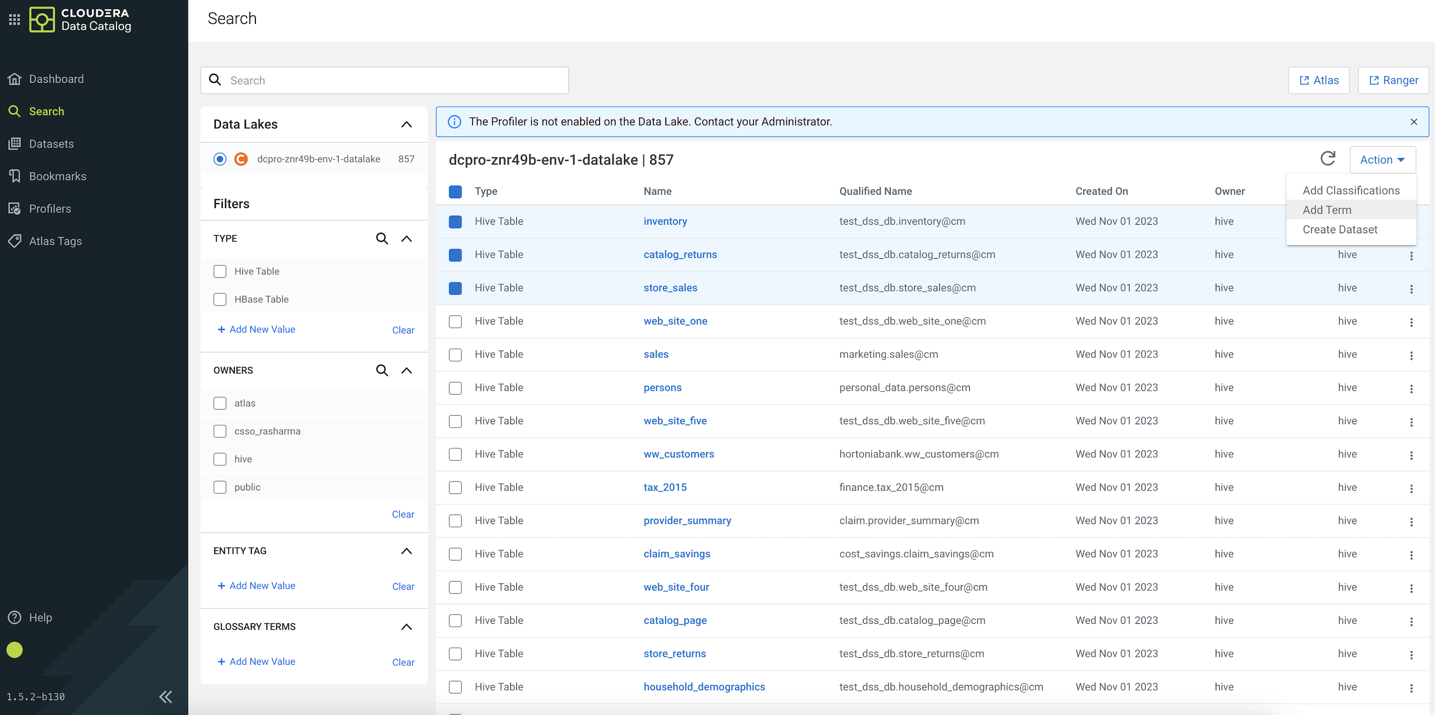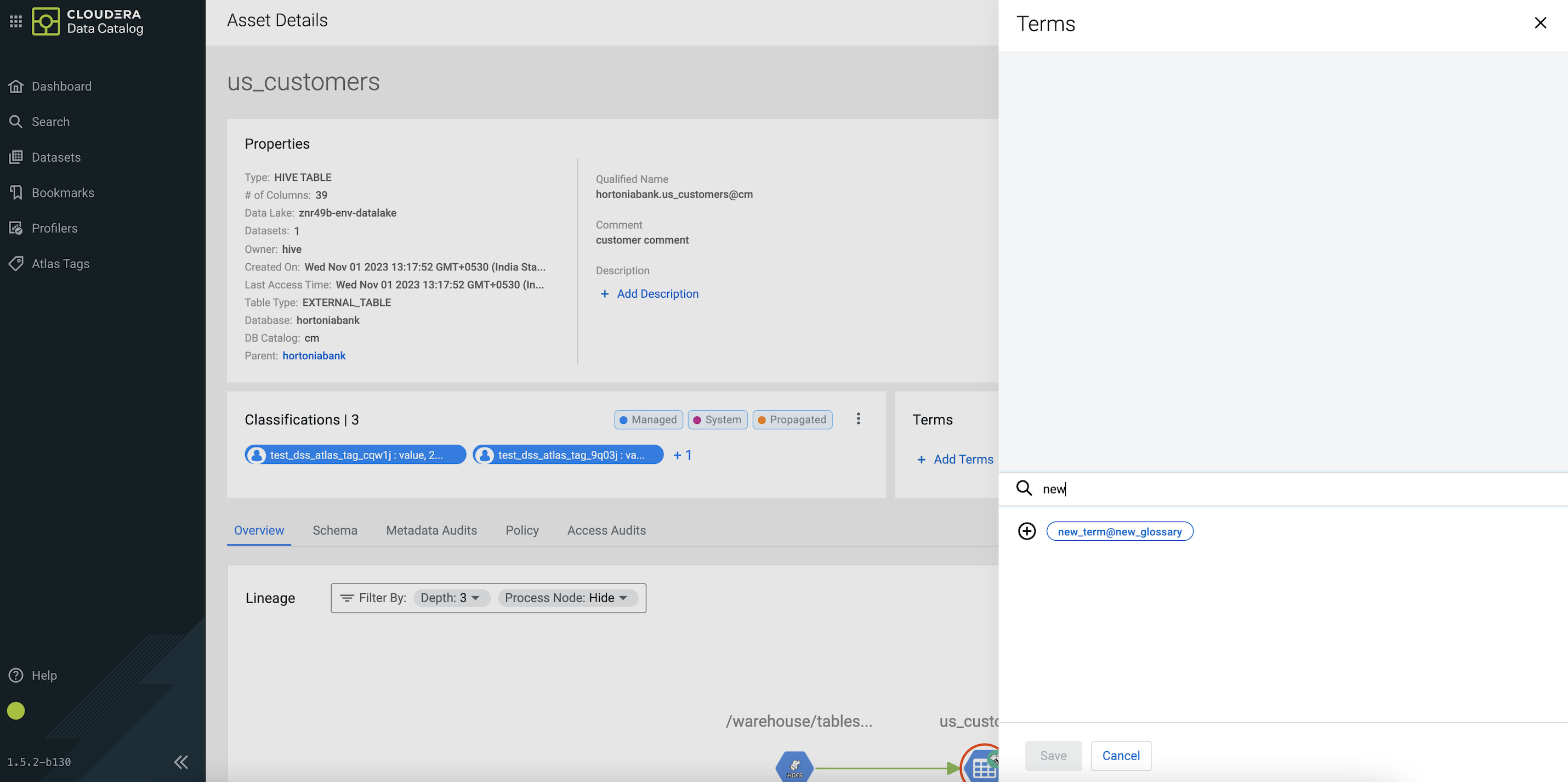 You can search for those terms in Data Catalog and map specific terms with Data assets. You can search for terms in Data Catalog to either add and delete them from the selected data asset. The selected asset displays the total number of terms associated or mapped accordingly.