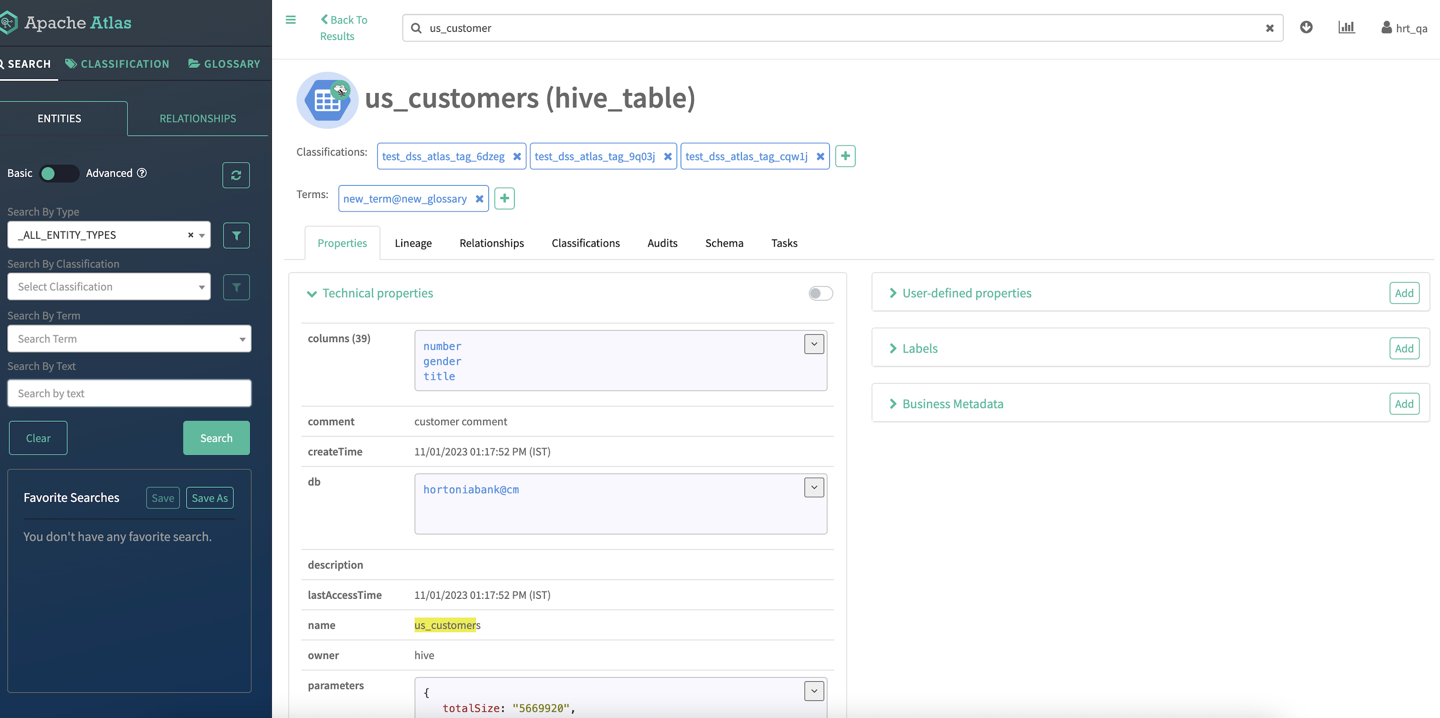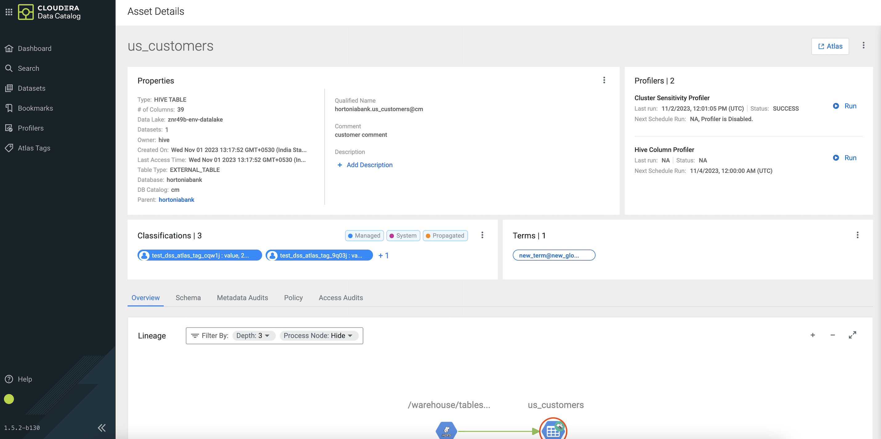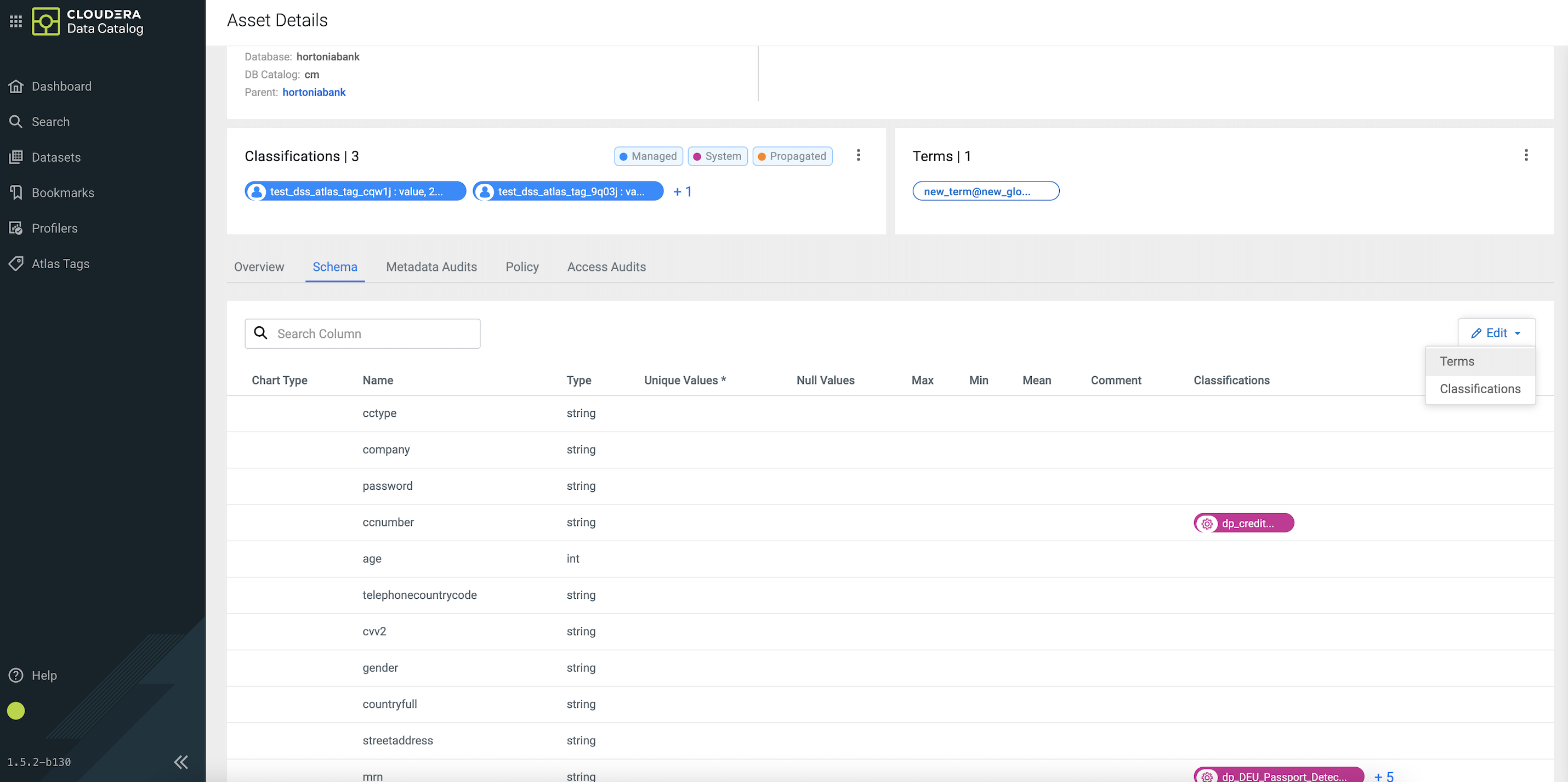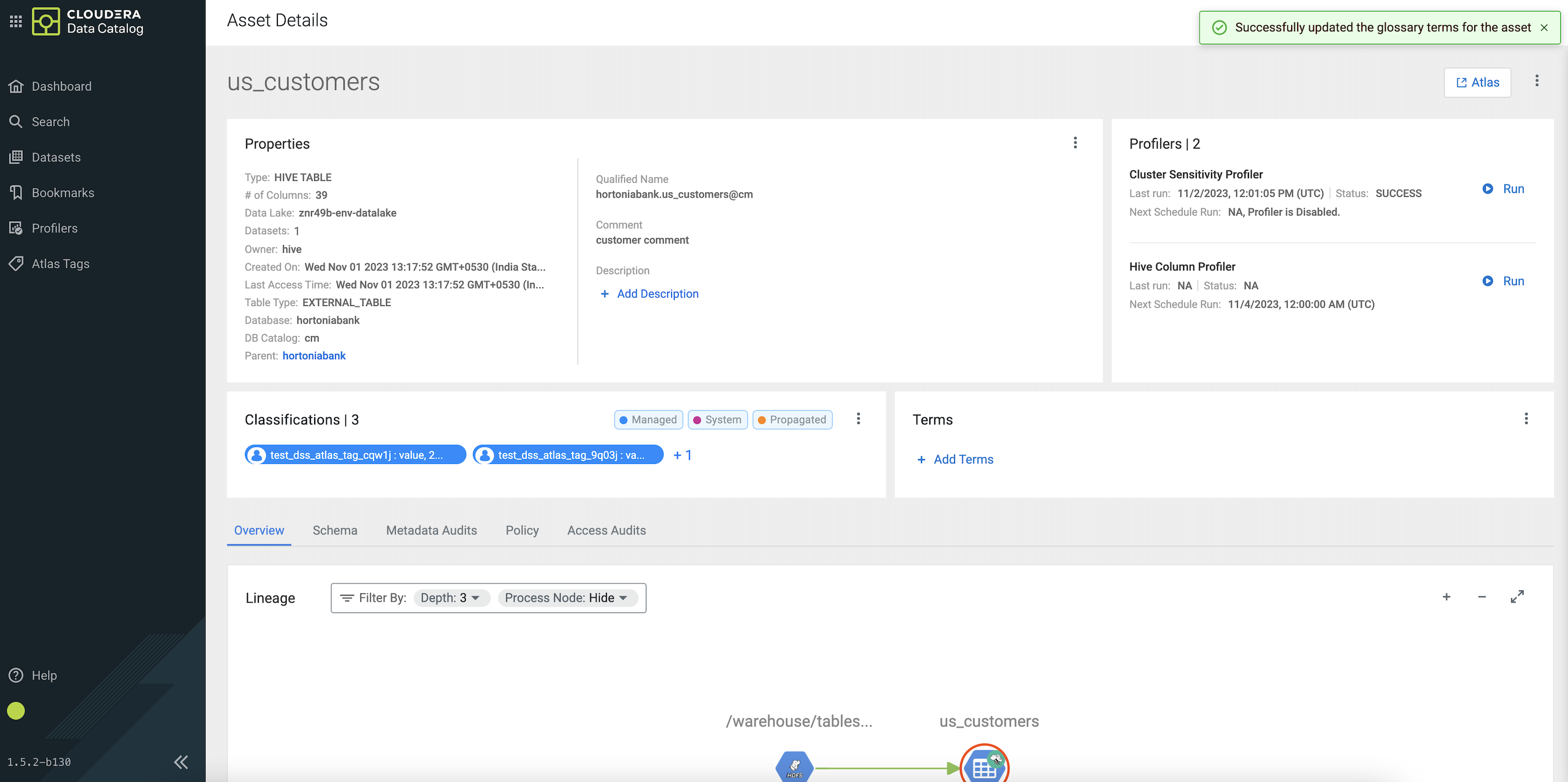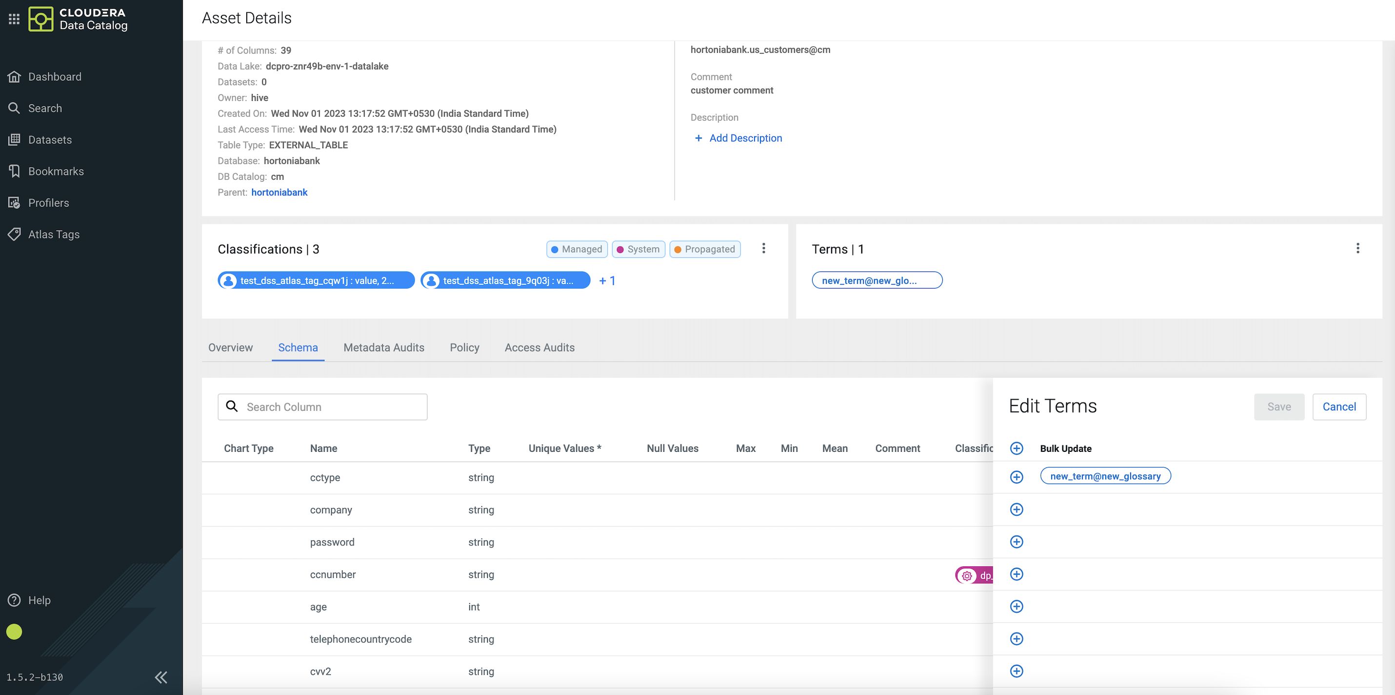When you select a Hive table asset and navigate to the Asset Details page, under the Schema tab, you can view the list of terms associated with the asset.