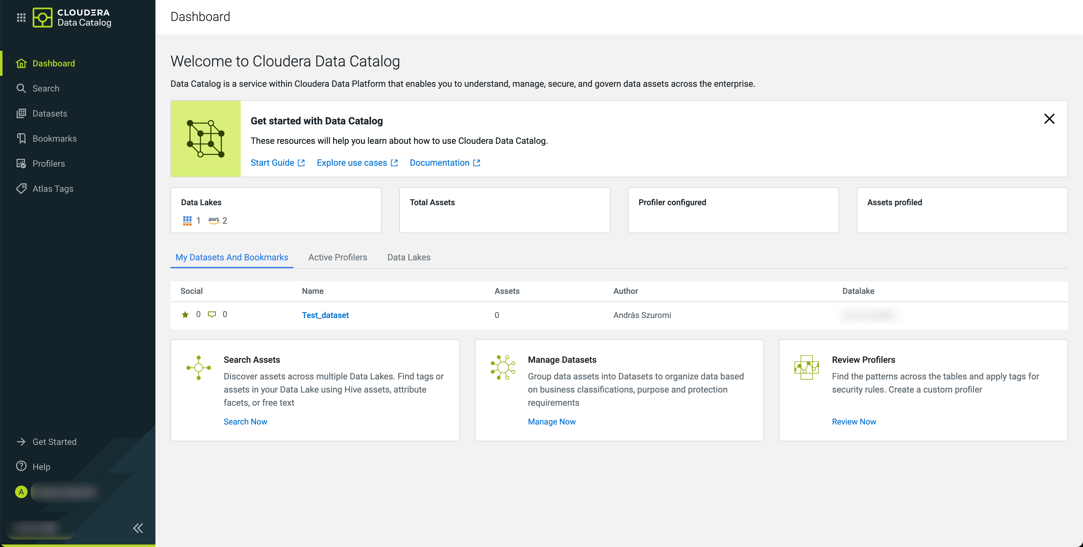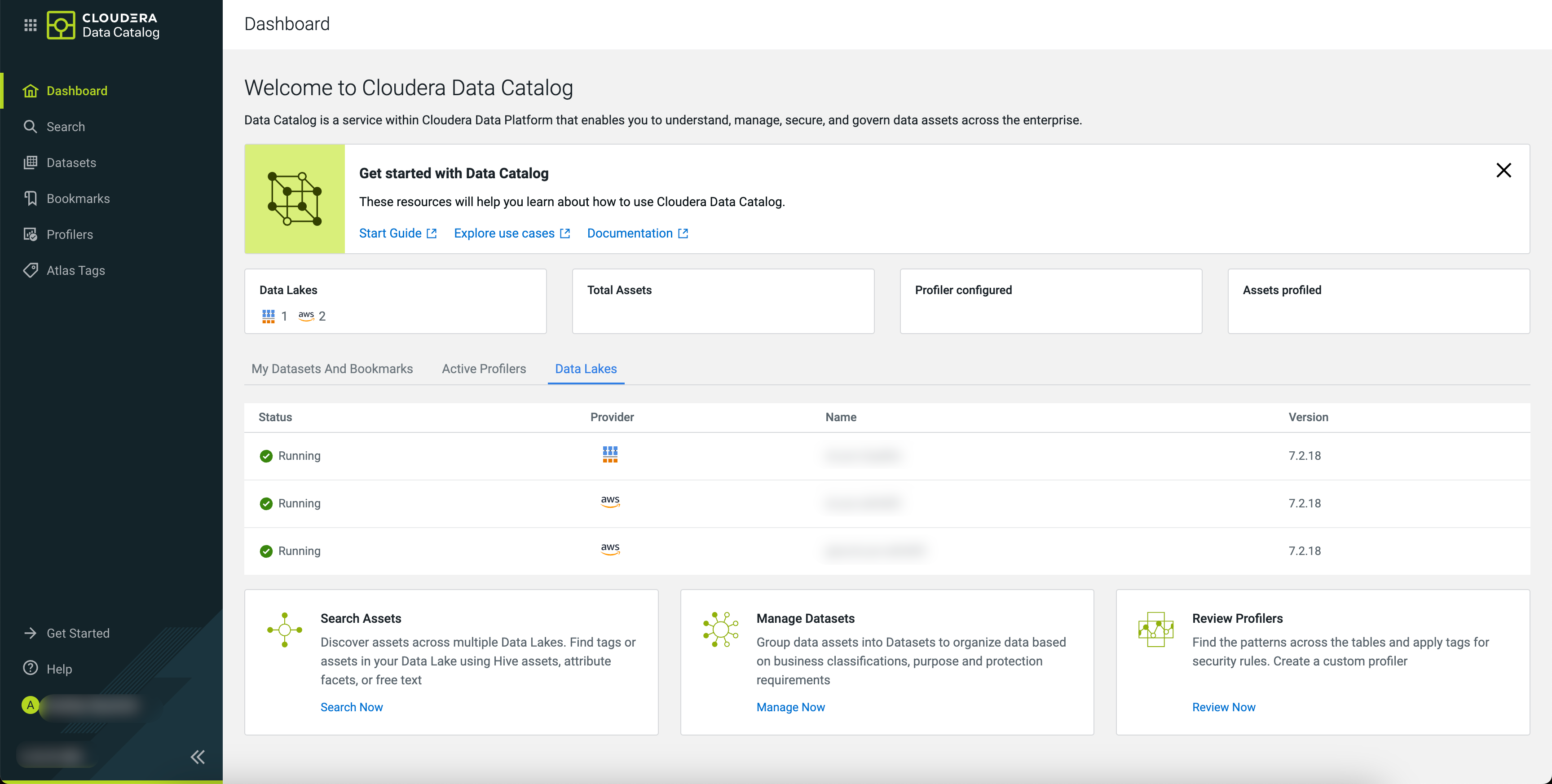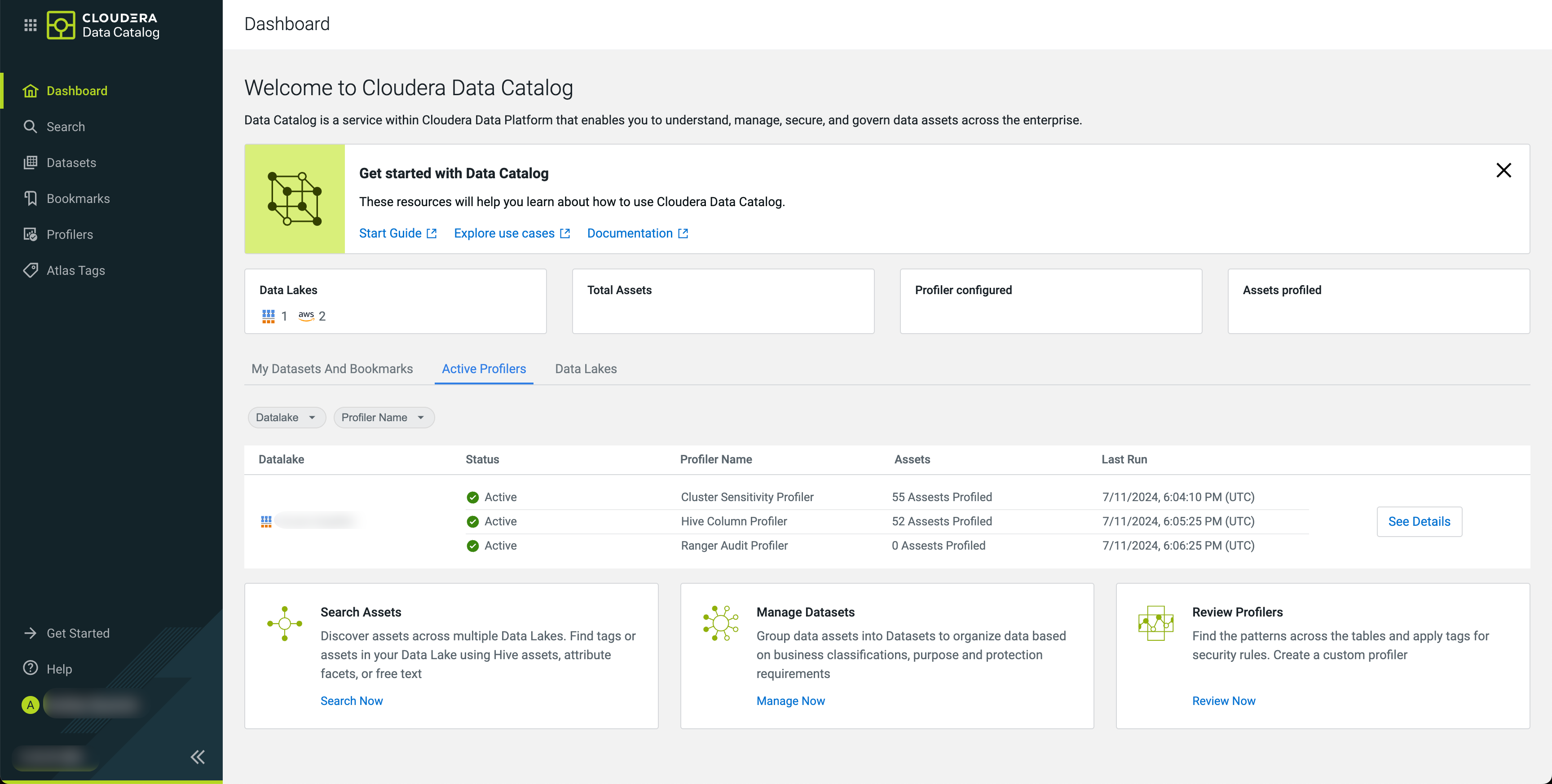 Additionally, you can manage the datasets, check the status of profilers, and search or discover assets.