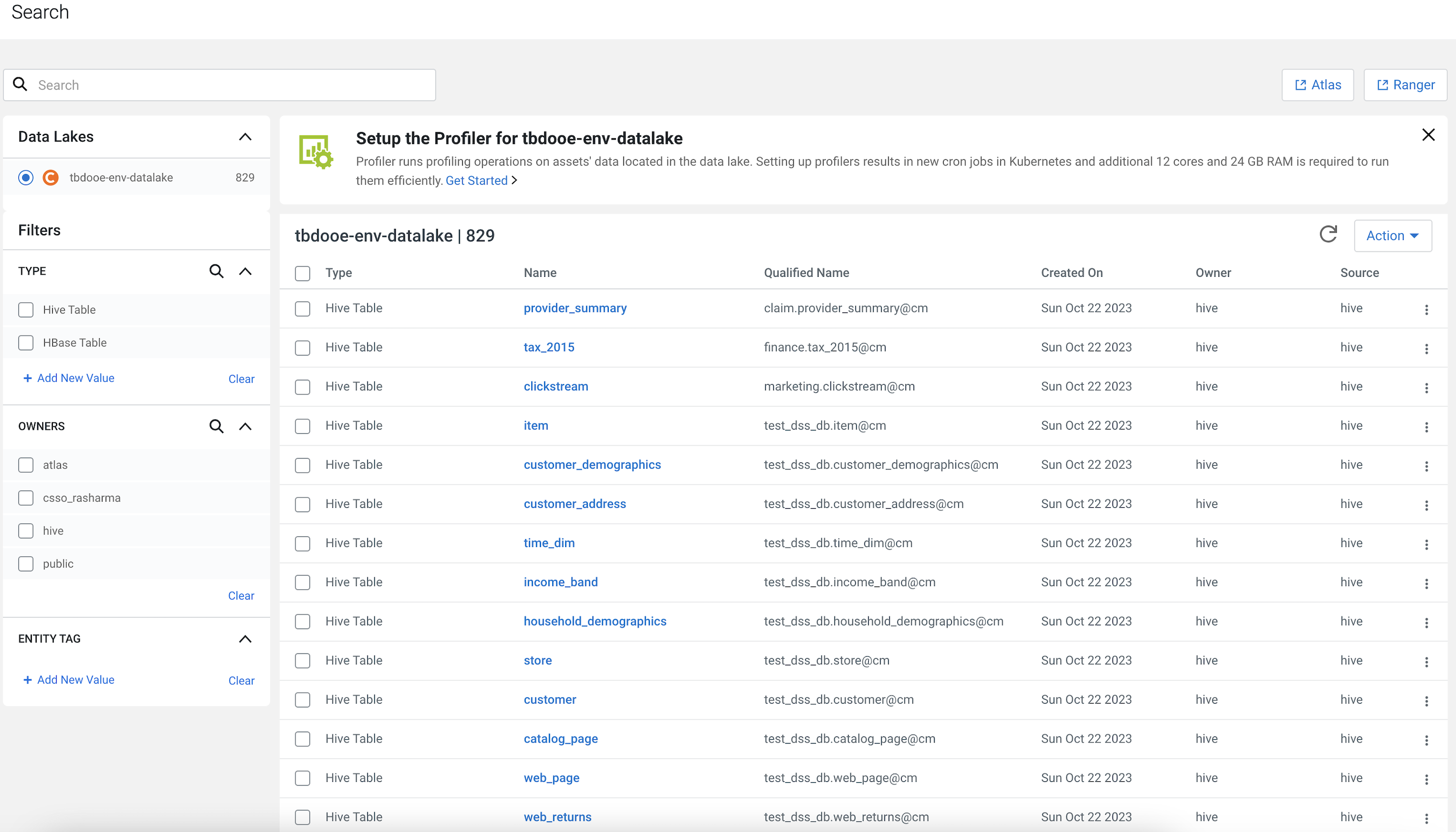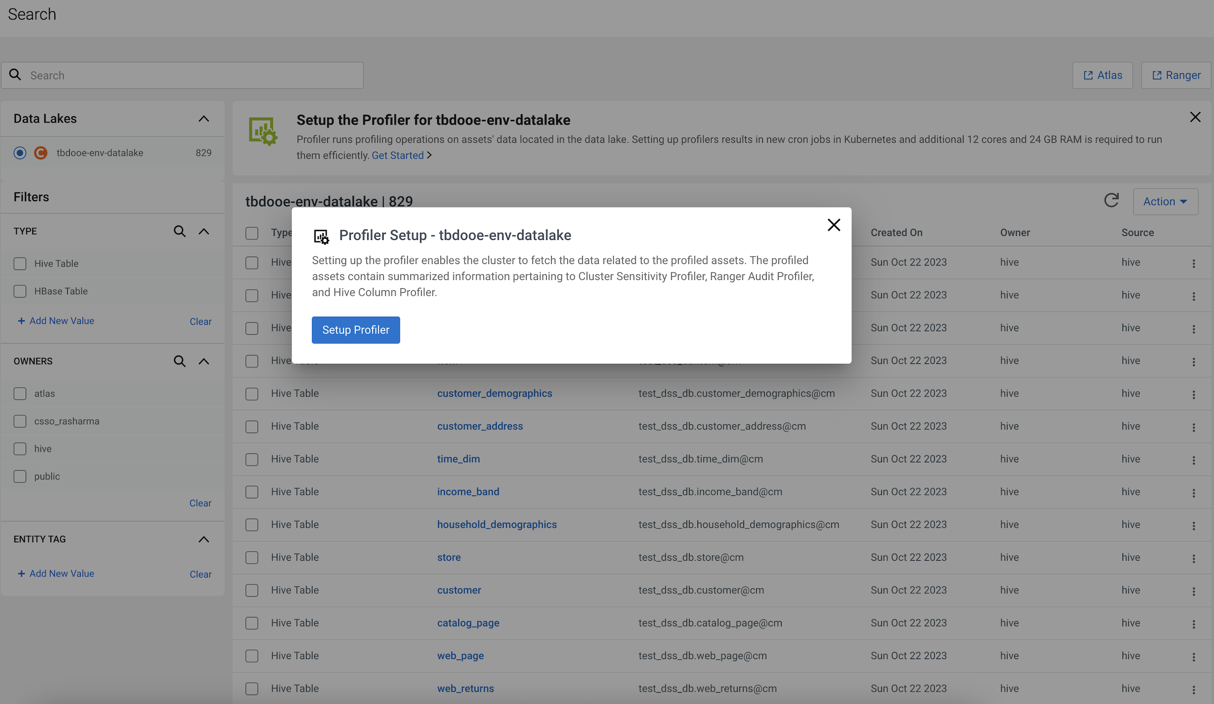 The setup profiler page is displayed for the data lake.