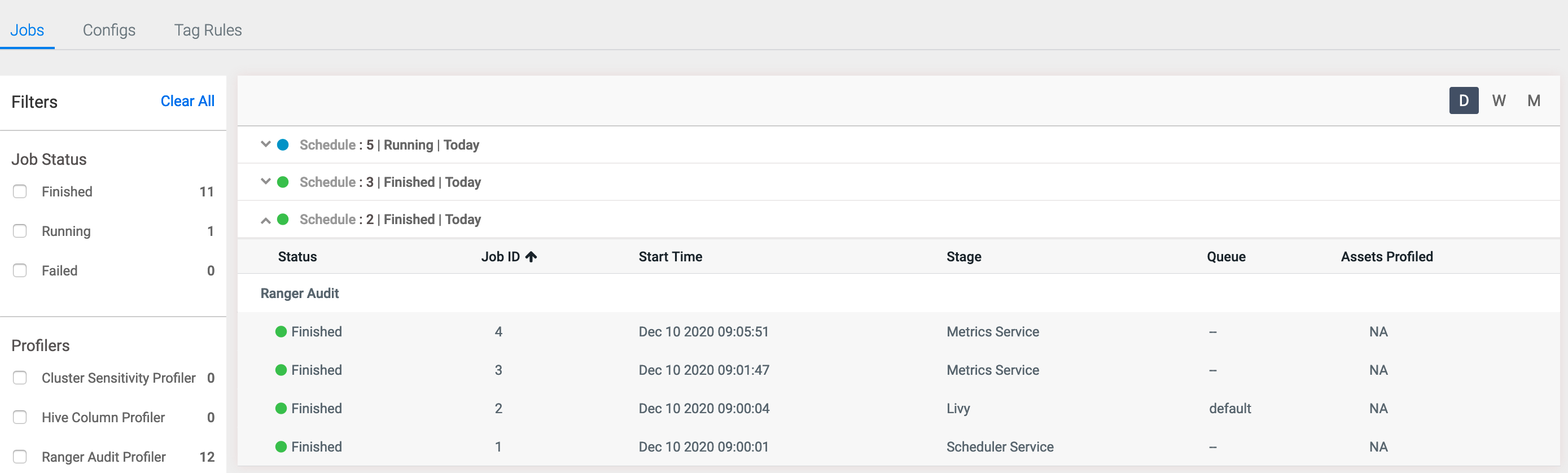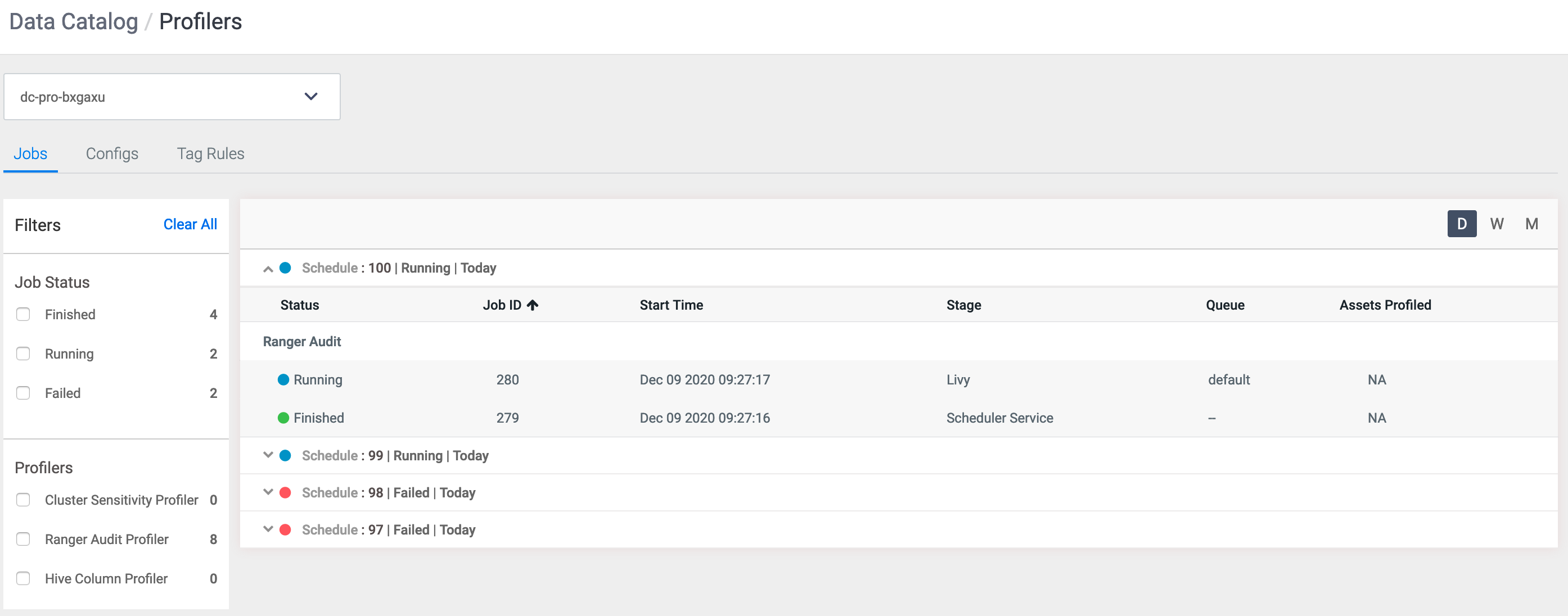 Using this data can help you to troubleshoot failed jobs or even understand how the jobs were profiled and other pertinent information that can help you to manage your profiled assets. Whenever the Schedule status appears in green, it indicates that the profiler job has run successfully. When the color appears in blue and red, it indicates that the profiler job is running or has failed.