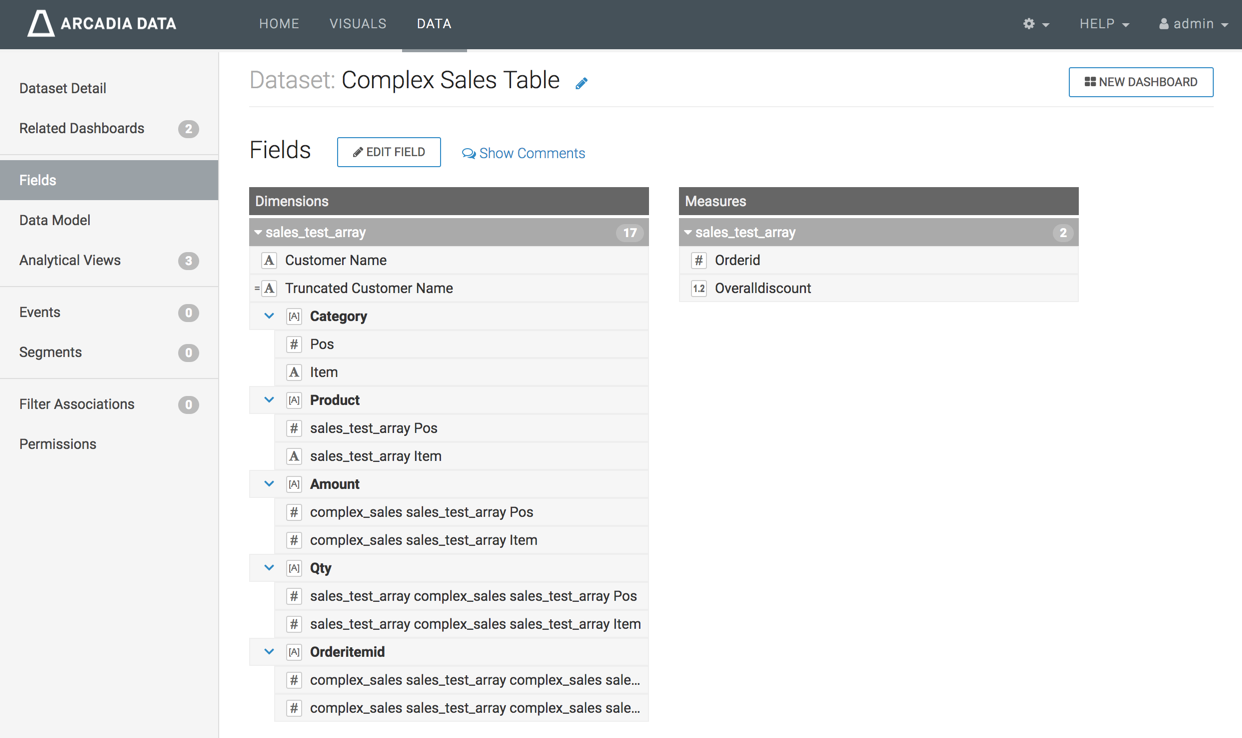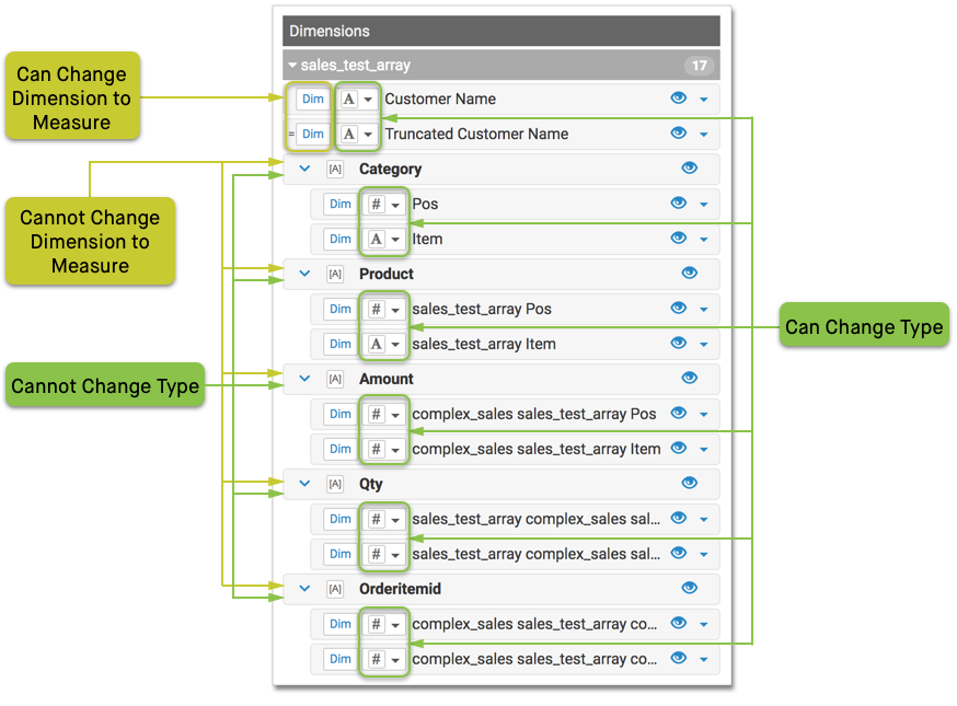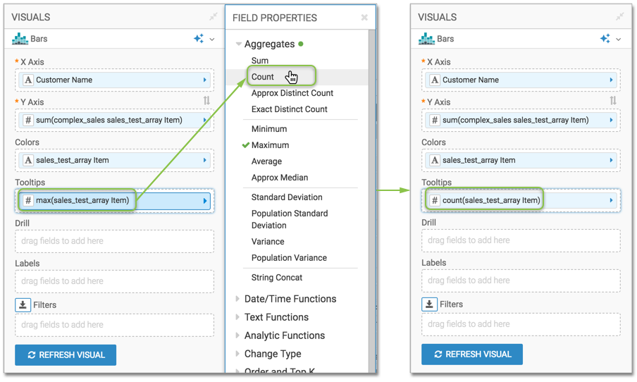 The expression editor supports the full use of Arrays, both in Dataset and Visual interfaces.