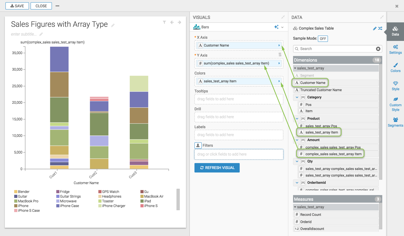 In the following illustration, we built a Bars visual with Customer Name on the X Axis shelf, the Amount:Item component on the Y Axis shelf, and grouped on the Colors shelf by Product:Item component.
