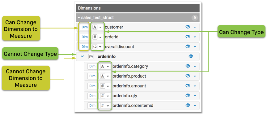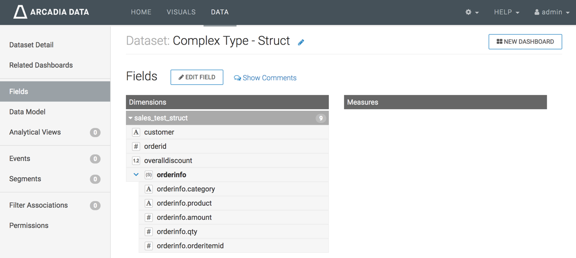 When we click Edit Fields, we can see that while primitive types can be cast as alternate data types (such as Integer into Real), the complex data type STRUCT cannot be changed to another type. However, the primitive components of the array may be cast as other primitive data types. Additionally, unlike other data types, uses complex datatypes only as Dimensions; they or their components cannot be re-defined as Measurements of the dataset.