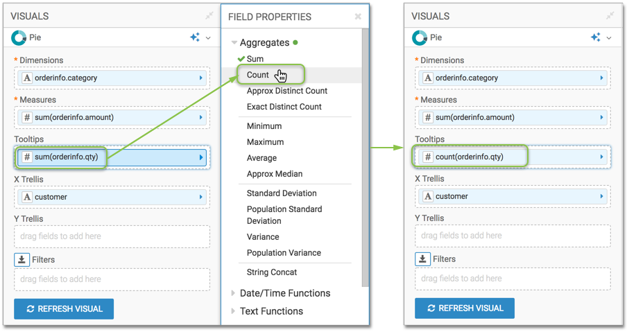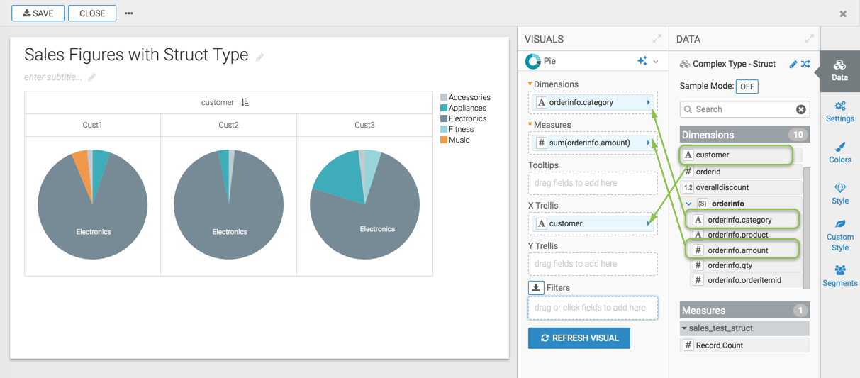 In the following illustration, we built a Pie visual with Customer Name on the X Trellis shelf, the orderinfo.category component on the Dimensions shelf, and the orderinfo.amount component on the Measures shelf.