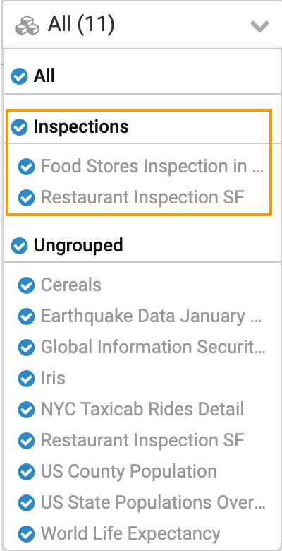 You can see the datasets grouped in the drop-down list in the Search modal window.