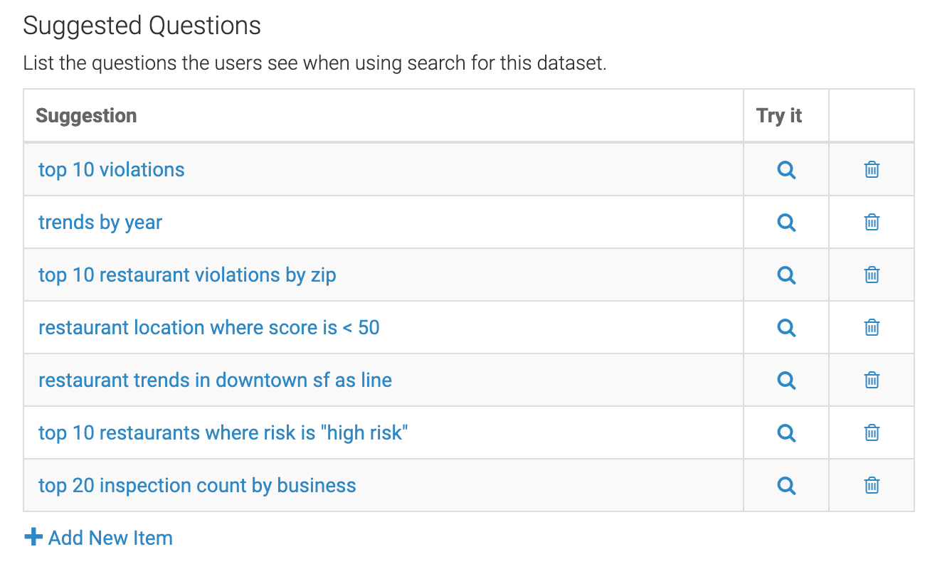 You can help users explore the dataset by pre-populating the dropdown with some search words and phrases in the dataset. You can also preview the results of the searches.