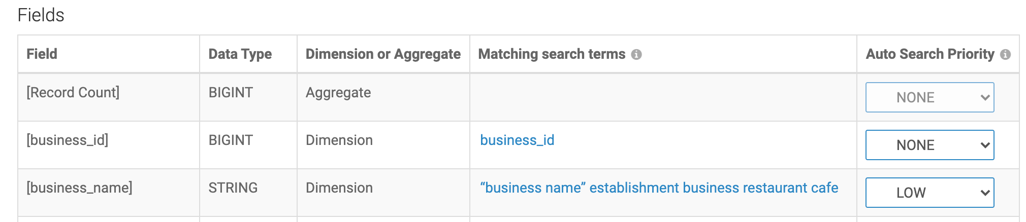 With Data Visualization, you can specify synonyms for dataset fields; these words can be used in Natural Language Search (NLS).