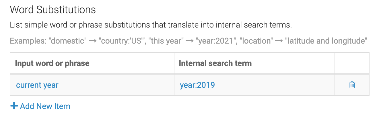Common words and phrases have specific meaning in each dataset. In this example, you can see how to specify the meaning of the phrase 'current year' and the word 'domestic' into internal search terms.