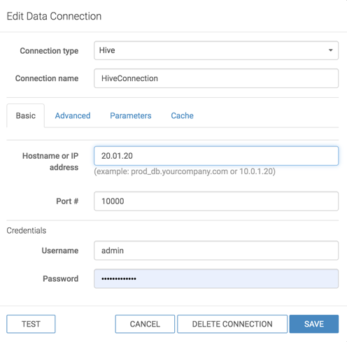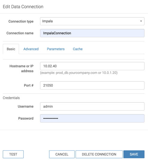 The following steps demonstrate how to edit existing data connections. The example shows changing an Impala connection to a Hive connection.