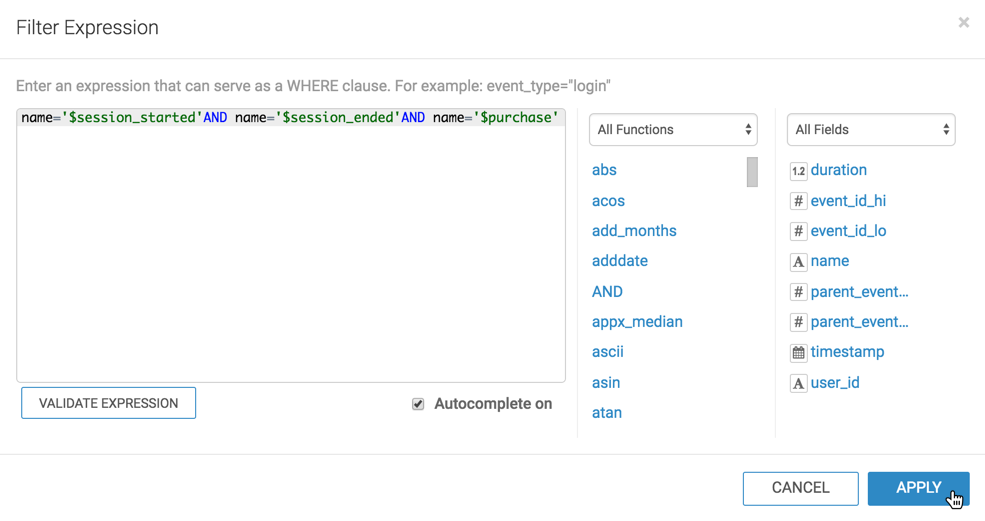 name='$session_started'AND name='$session_ended'AND name='$purchase' -