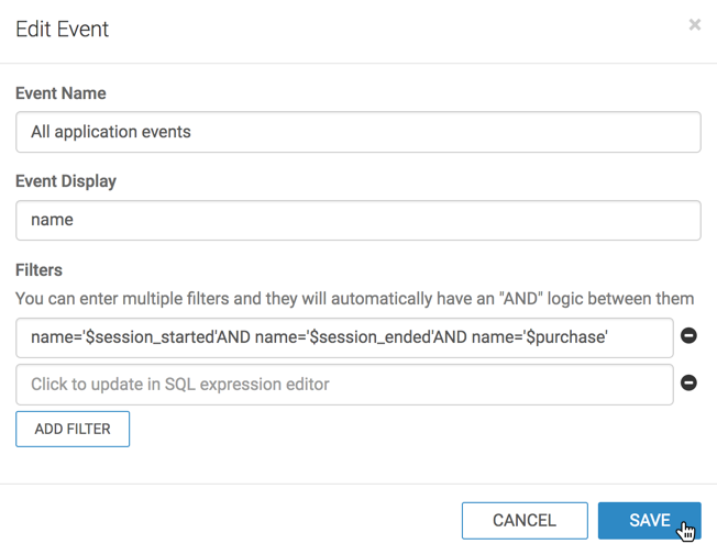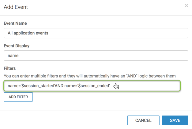 name='$session_started'AND name='$session_ended, to open a Filter Expression modal window and edit the expression.