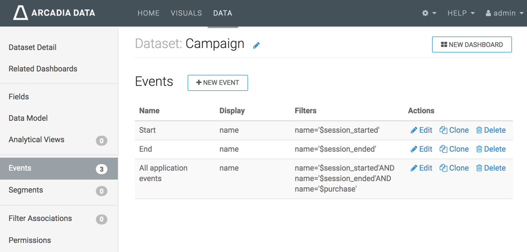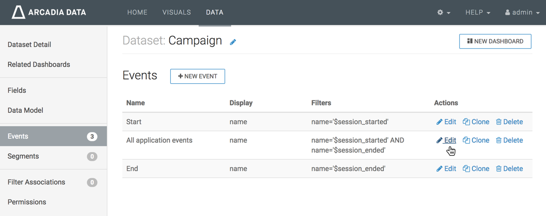 The following steps demonstrate how to edit an event in a dataset. You can use the event All application events that was created in Creating Events.