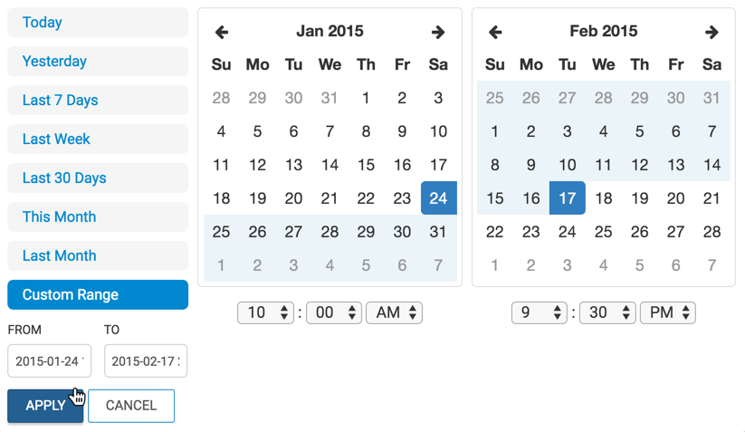 - Custom Range, that can be configured either through the FROM and TO entry boxes, or by manipulating the calendar widgets