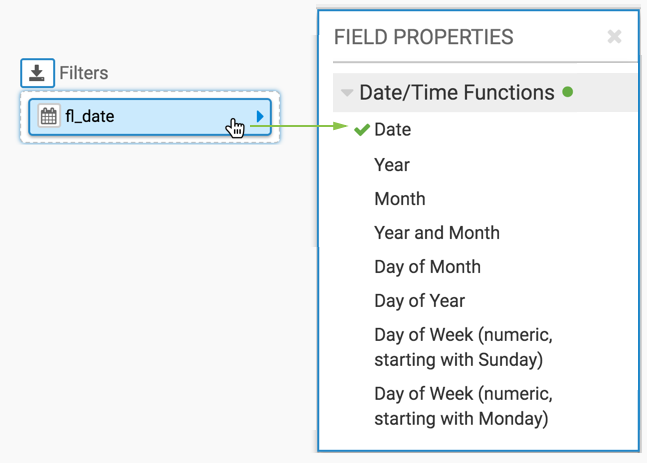fl_date.Click the filed name, and under the Field Properties, change the Date/Time Functions to Date.
