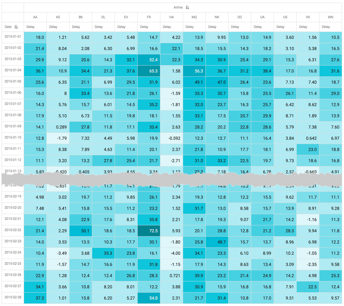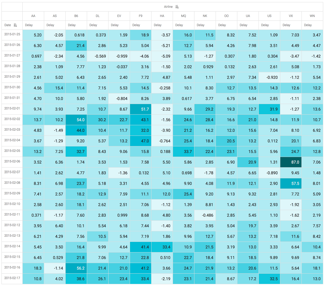 dep_delay, and ensure that it uses theavg(dep_delay)aggregate. Alias the field asDelay. - On the Filters shelf, add