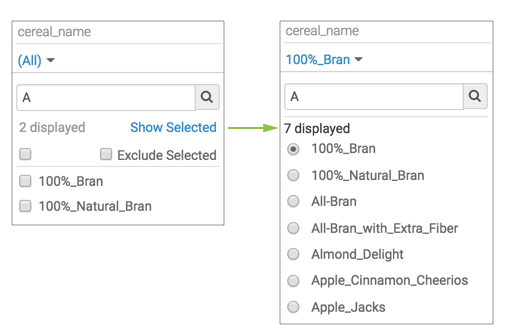 In a dashboard filter, you can change the maximum number of options that appear during search. This limits the display of options for datasets with a very large variability.