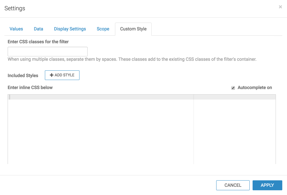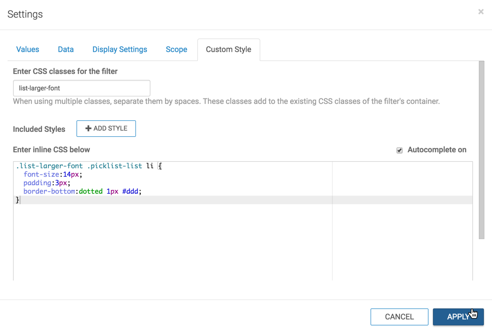To configure a custom style on a dashboard by entering a custom CSS code, follow these steps: