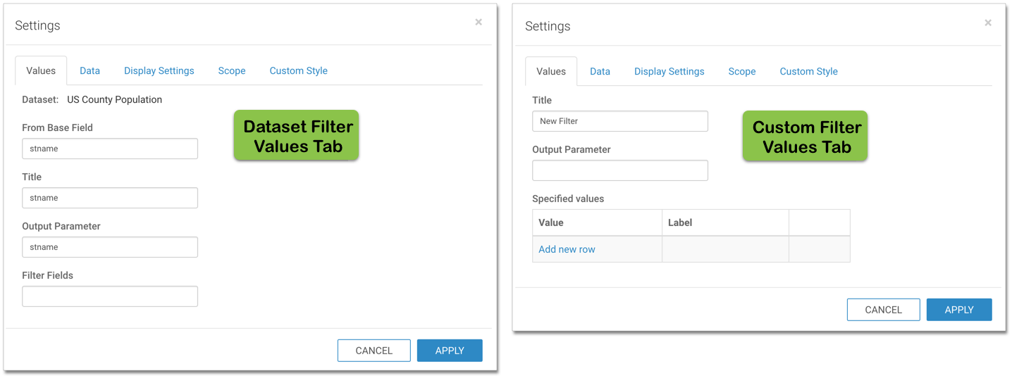 In custom filter widgets, this specifies the distinct values of the output parameter on which the filter acts, and labels them.