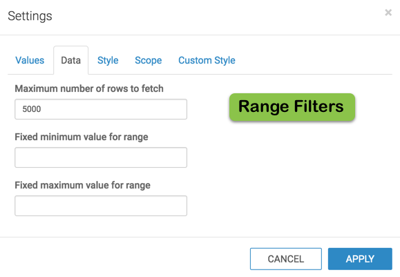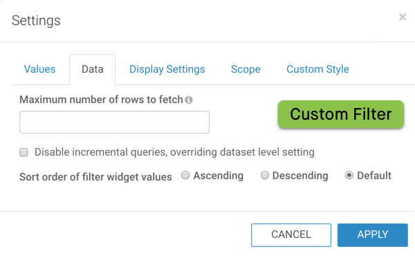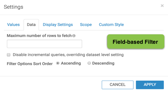Configuring data options for dashboard filters allows you to configure data options of a newly created field-based or custom filter in a dashboard. Follow these steps to configure data options of a filter: Click the Gear icon on the filter widget. In the Settings modal window that appears, click the Data tab Notice that Filter Options Sort Order has two options for field-based filters and three options for custom filters. Select one of the following options: Dashboard: changing maximum rows to fetch Disabling incremental queries in filters Configuring sort order in filter values Dashboard: changing maximum rows to fetchIn a dashboard, enables you to specify maximum number of rows to fetch in a visual request based on a field or a custom filter in a dashboard.Disabling incremental queries in filtersIn the Data menu of a newly created field-based or custom filter in a dashboard, enables you to disable incremental queries at the level of the dashboard filter Configuring sort order in filter values enables you to select the sort order of filter values.