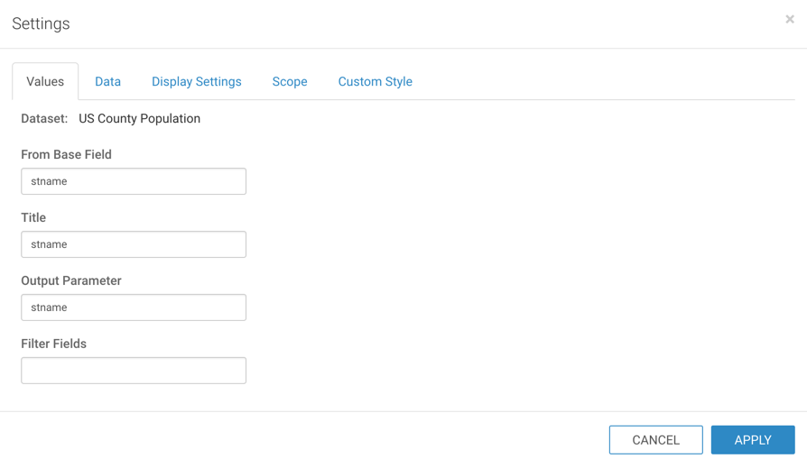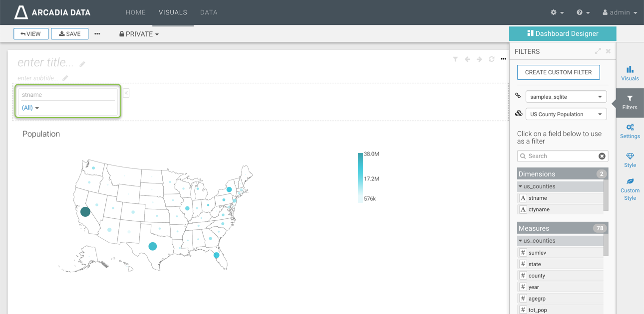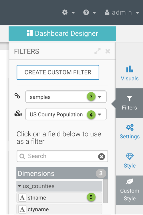 Click on any of the fields of the dataset to add to the dashboard a widget that filters