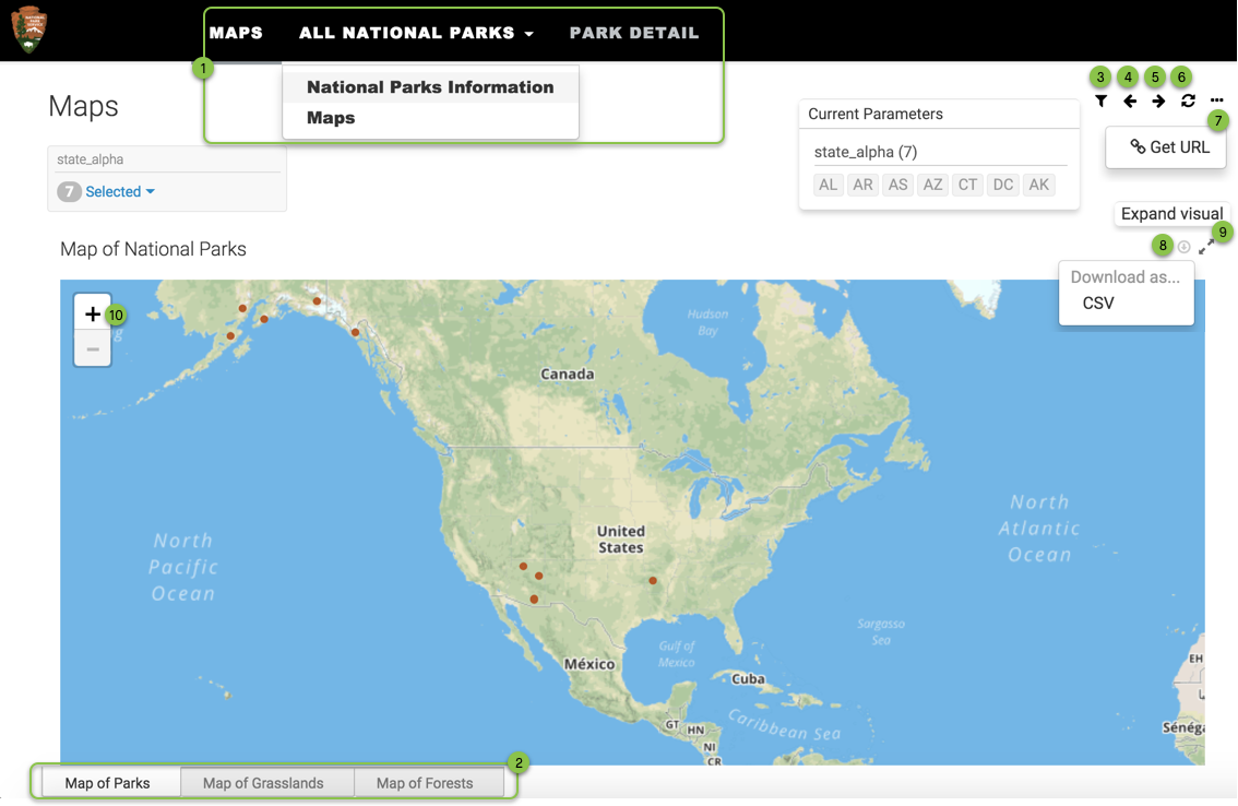 - The tabs at the bottom correspond to the individual sheets in each dashboard. They appear only if the dashboard has two or more sheets.