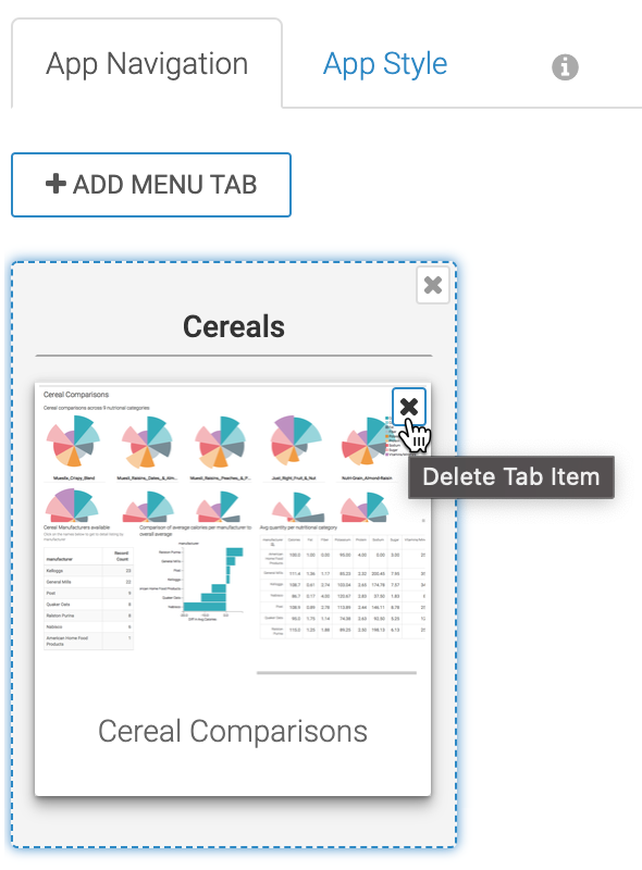 Removing a dashboard from a tab In the App Designer of CDP Data Visualization, it is very easy to remove dashboards. In the App Navigation interface, hover over a dashboard in a tab, and click the (remove) icon on the dashboard. At this point, the App Navigation interface still has the tab you used, but the dashboard has been deleted. To ensure that the change persists, click Save.